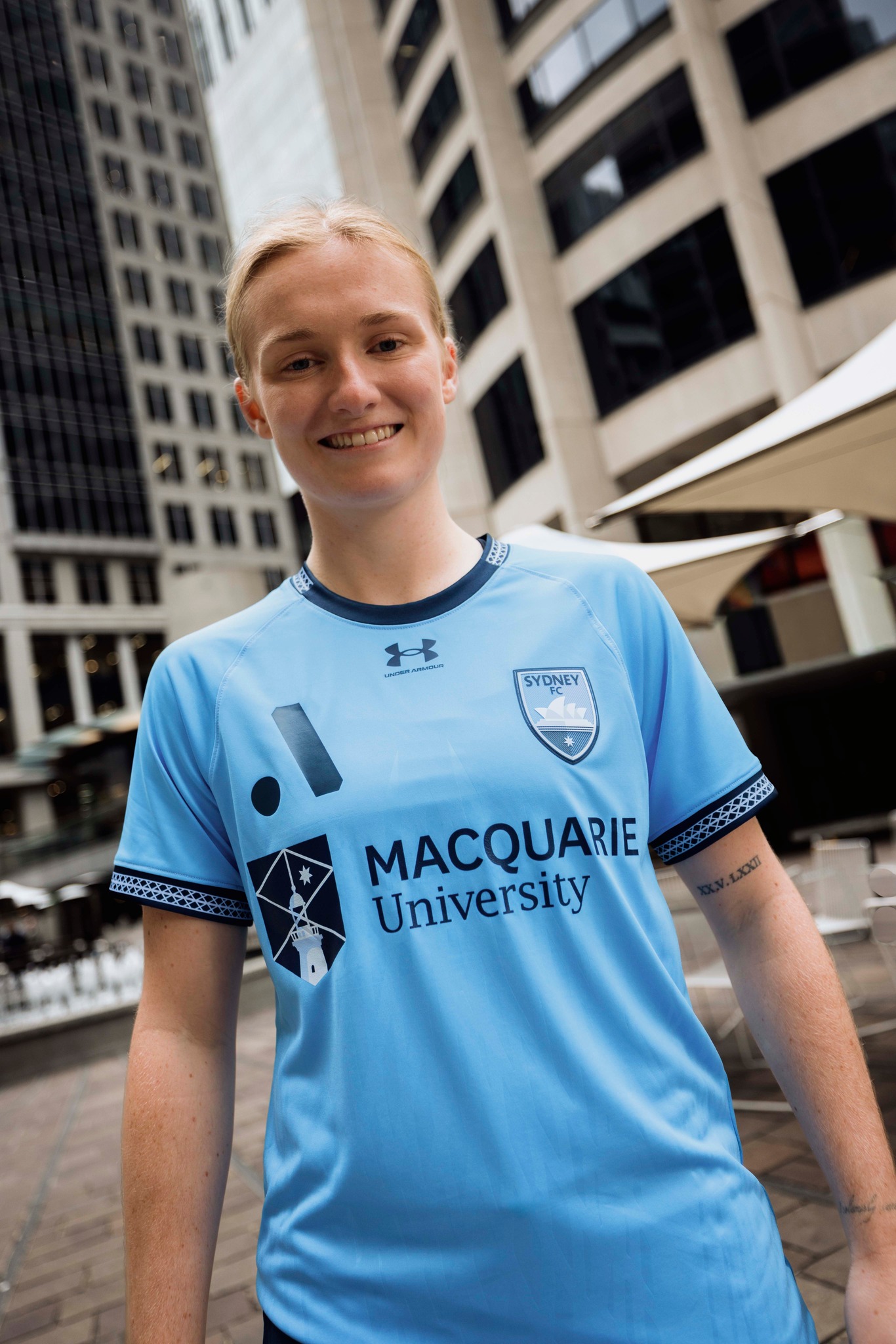 The Under Armour Home kit features a sky blue shirt with patterned sleeve cuffs and subtle graphic elements on the torso, while the Macquarie University sponsor is displayed on the chest alongside the club crest and UA logo. Navy detailing runs across the collar and sleeves, completing the look with matching navy shorts and sky blue socks.
