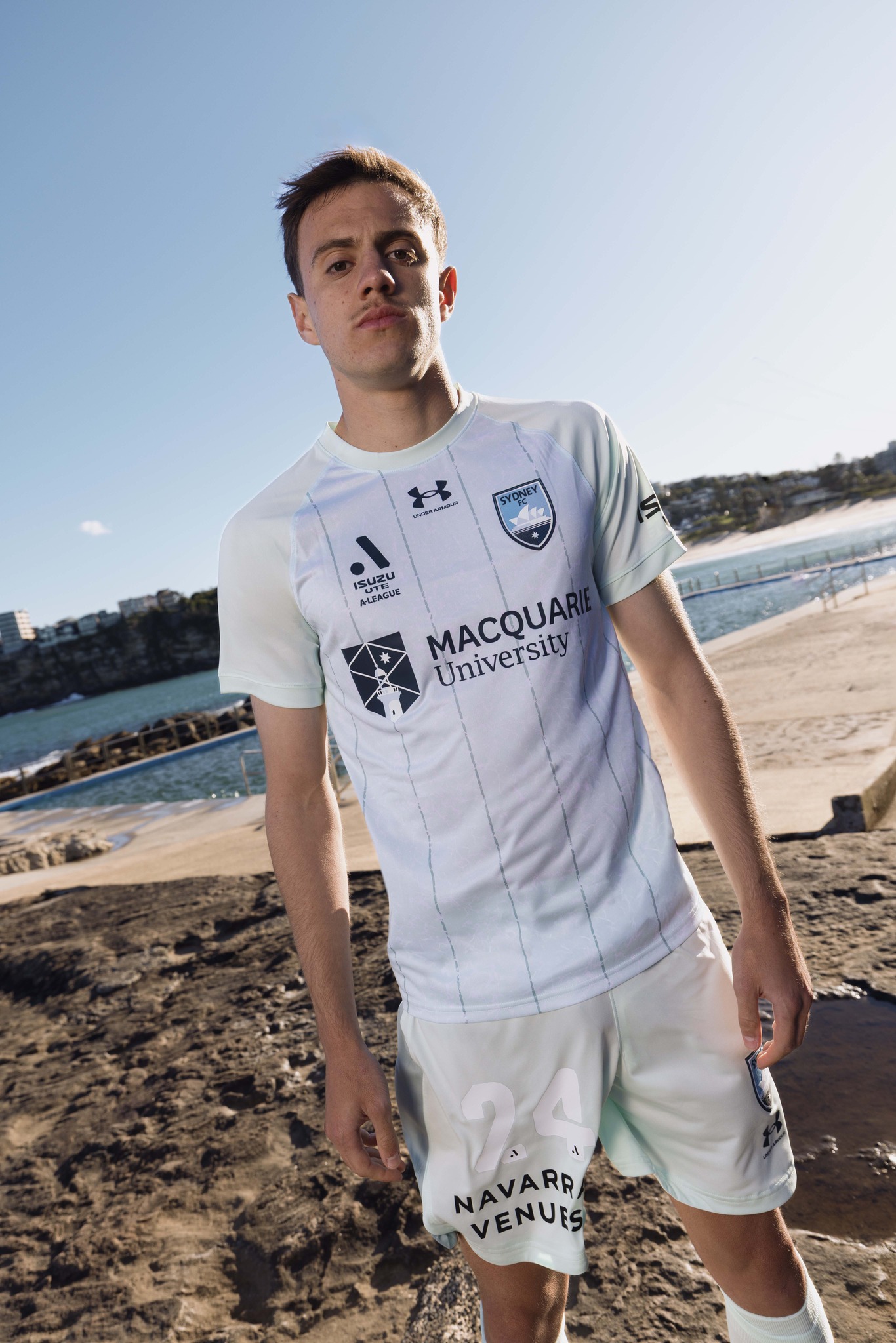 The away kit combines an off-white tone across the shoulders, back, shorts and socks with a bright white front panel. Faint vertical striping runs through the front, drawing inspiration from Sydney’s coastal setting and ocean pools. Navy trims and accents mirror elements of the home design, with the women’s away kit featuring navy shorts. Both kits carry the Isuzu UTE A-League patch on the sleeve.