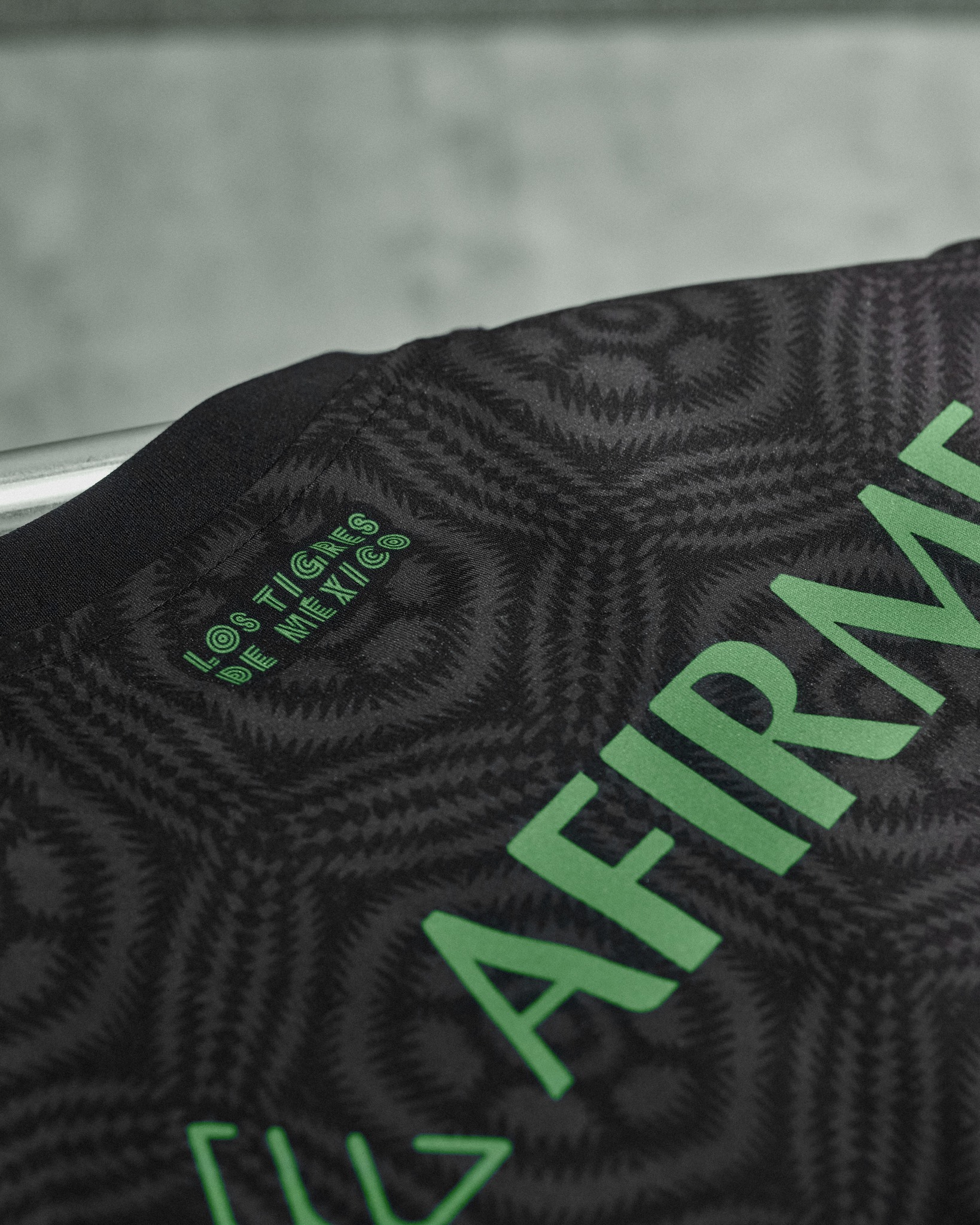 The Tigres football shirt is presented in a black and dark charcoal base, with green detailing applied across multiple elements of the kit. A repeated tonal pattern runs throughout the fabric, forming a structured graphic across the front, sleeves and back.