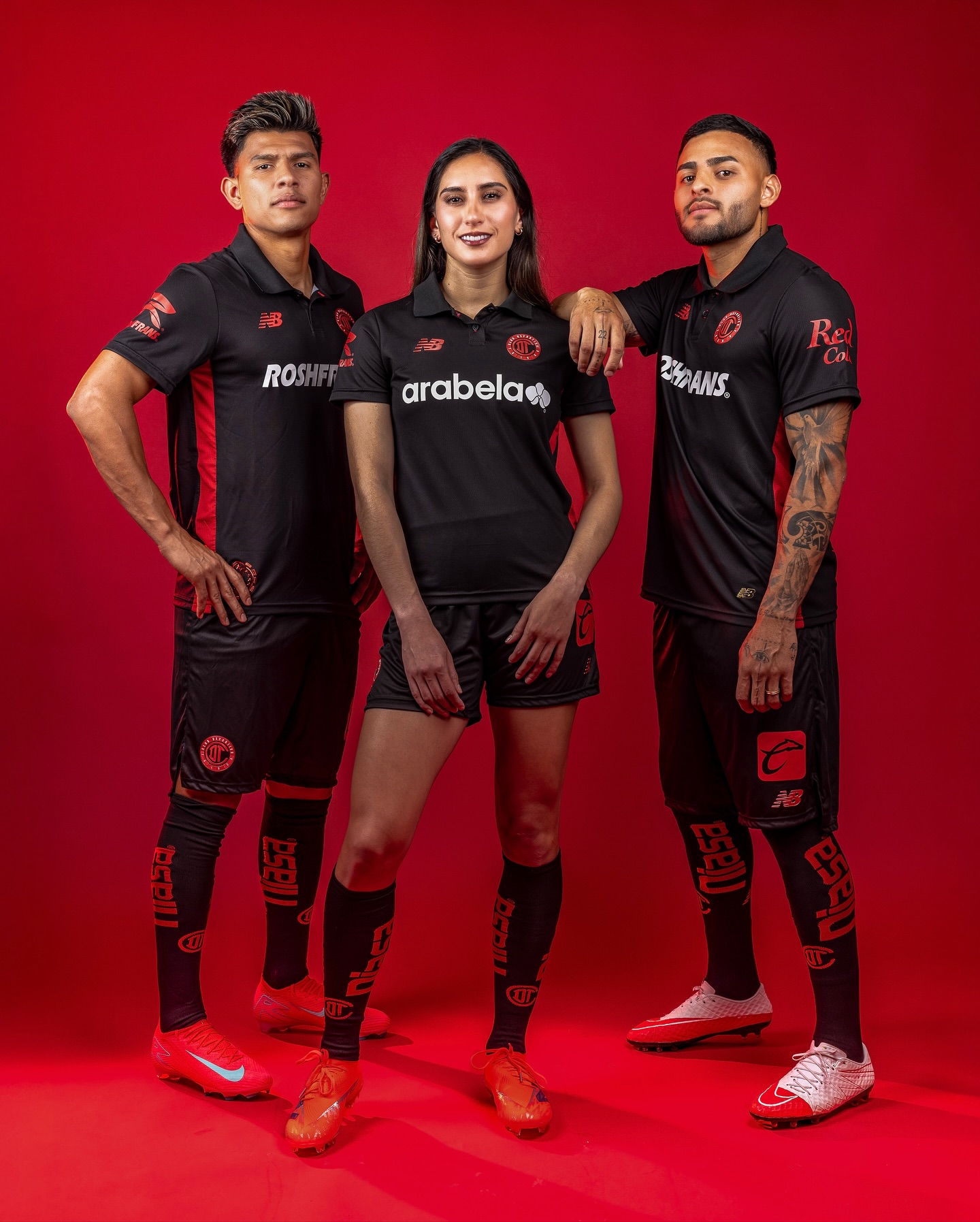 The jersey is predominantly black with red accents, with the club crest and New Balance logo in red on the chest, while sponsors including Roshfrans and Arabela appear in contrasting white. Additional branding such as Corona and Caliente feature on the back, alongside the squad number and player name in large red print.