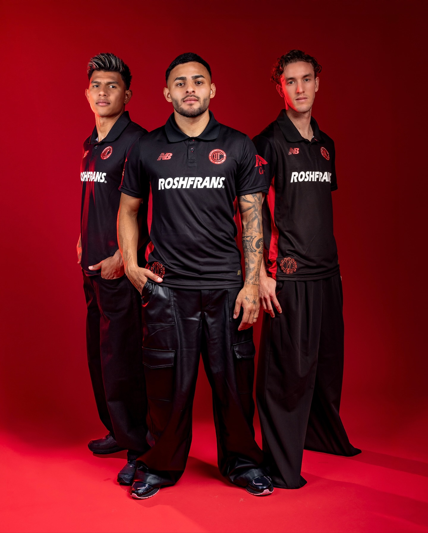 The kit is completed with black shorts and socks that incorporate red elements, with the socks carrying the club’s name printed vertically in red alongside the New Balance mark.