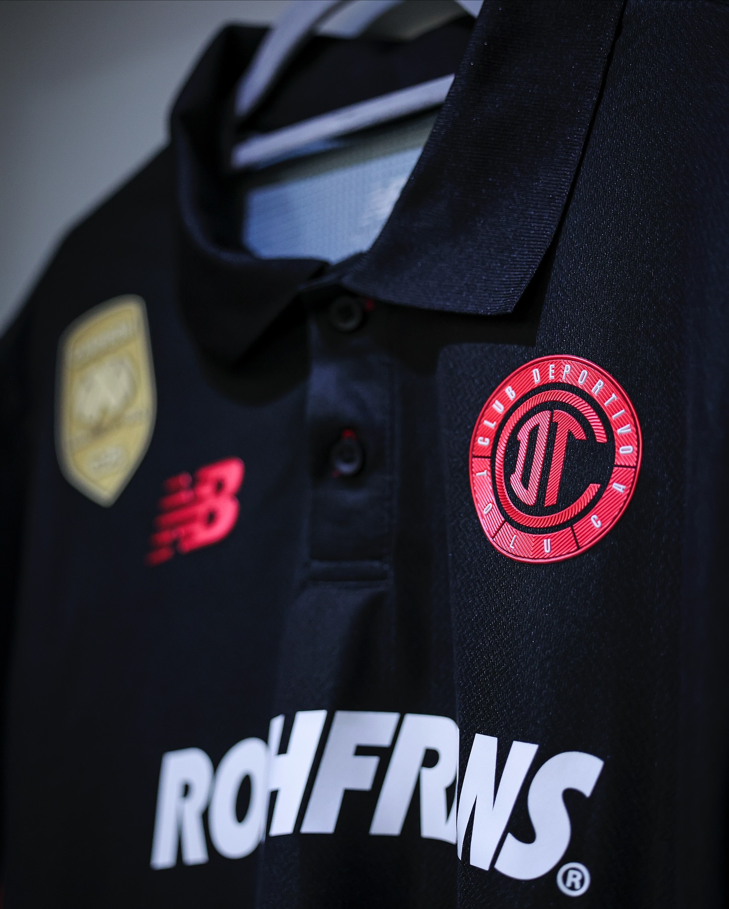 The shirt features a polo-style collar and button closure, with red detailing also present on the side panels and sleeve logos. At the lower section of the jersey, a special emblem is applied to commemorate the club’s history of league triumphs, presenting the Liga MX trophy outline surrounded by stars and the years of Toluca’s championship victories.