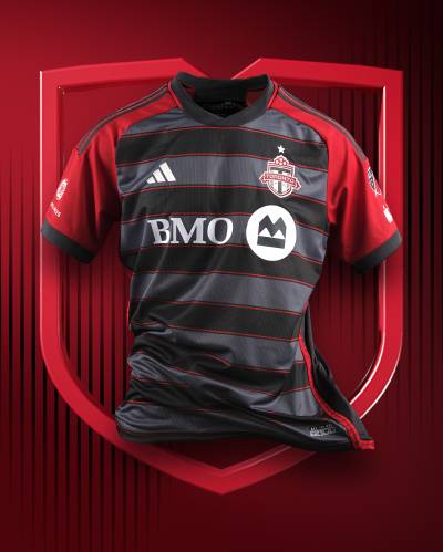 The jersey pays tribute to the heart and home of the club, featuring onyx stripes and embroidered details that represent the team's most significant moments and the sounds of Toronto FC's game nights.
