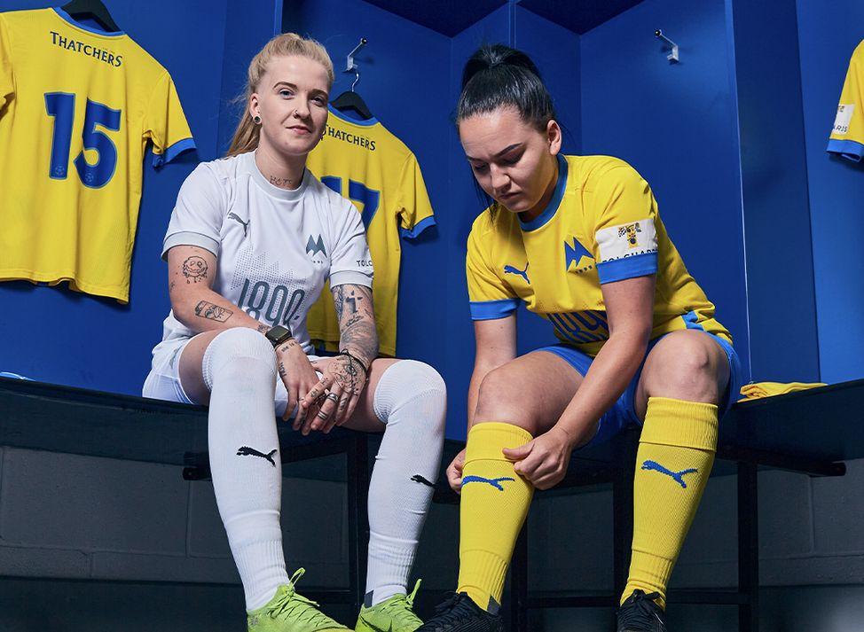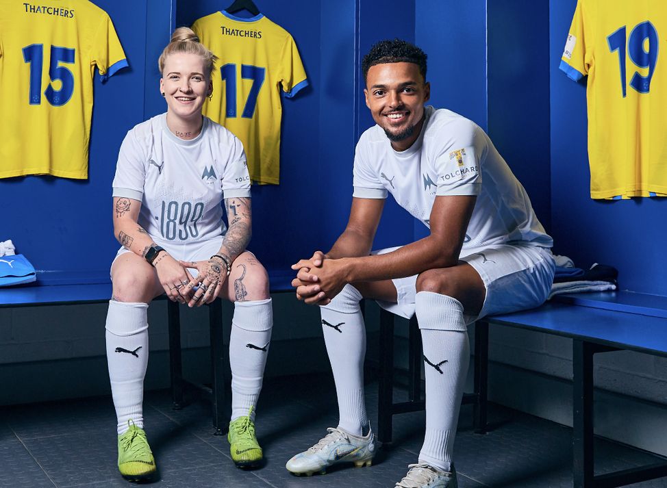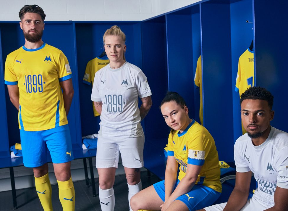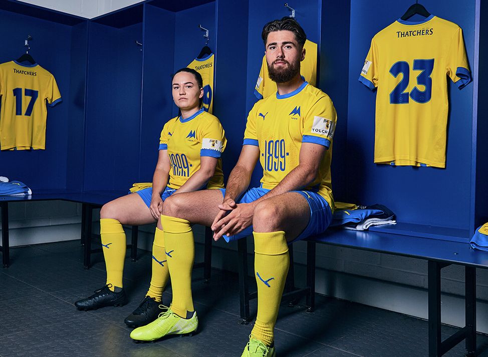 The 2022-23 primary design for the Devon-based English National League side is in yellow with blue embellishment, while the change shirt - in the same template - is in white with grey detailing.