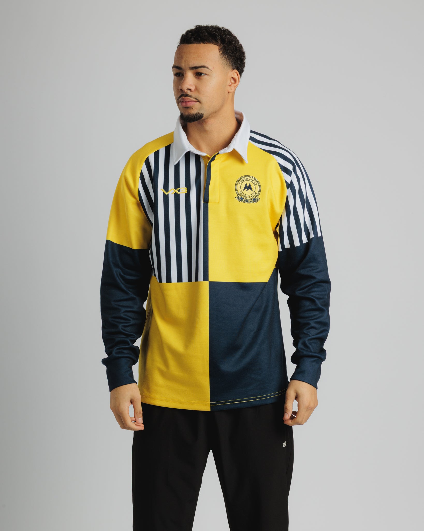 The Torquay United crest is embroidered on the chest, paired with the VX3 logo in matching yellow stitching. Additional detailing includes a stitched back neck element and reinforced seams.