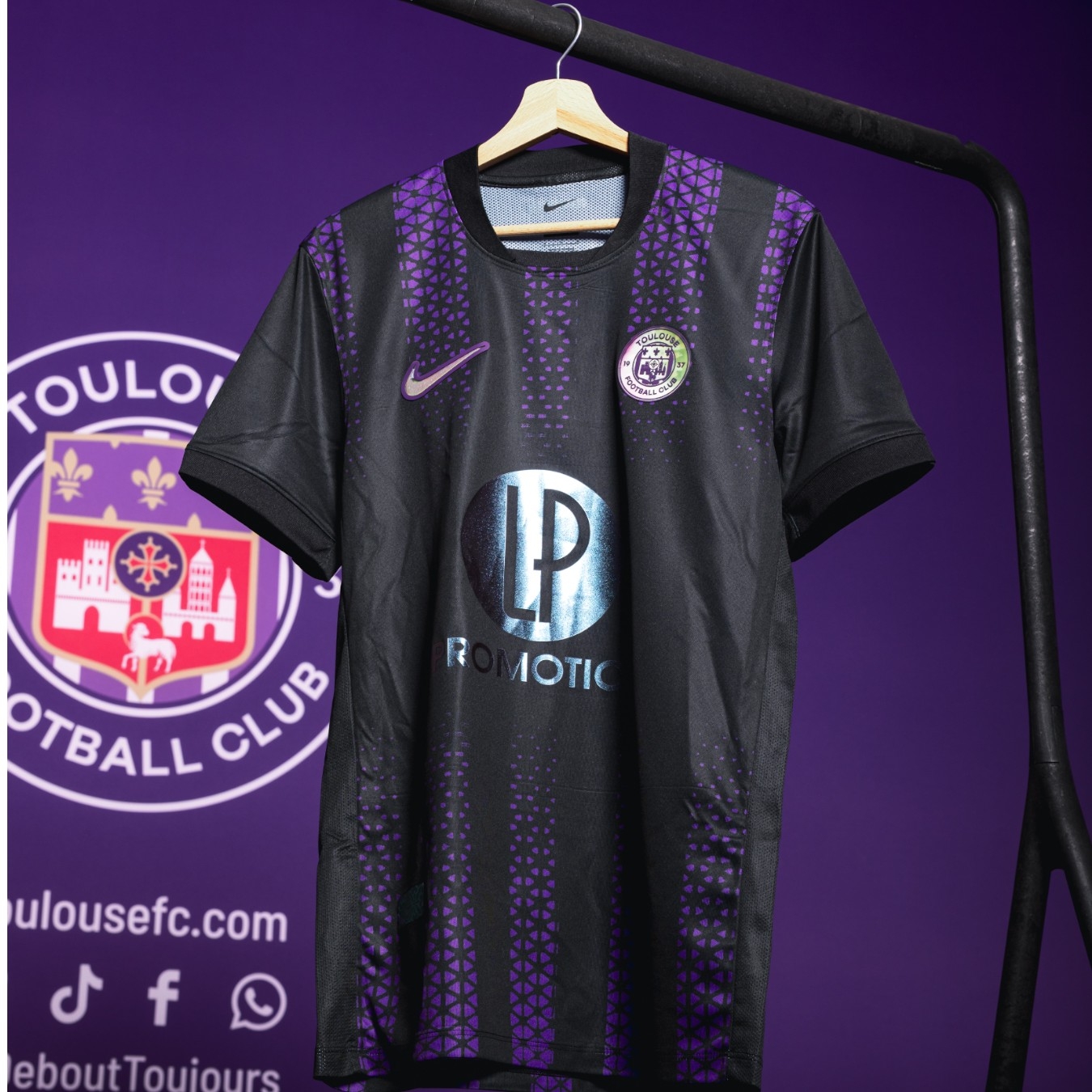 The rear of the shirt is kept minimal, featuring a clean black mesh panel with the same lower patterned section as the front. The new Toulouse kit is completed with matching black shorts and socks featuring purple accents and will be worn by Toulouse FC during selected 25/26 fixtures.