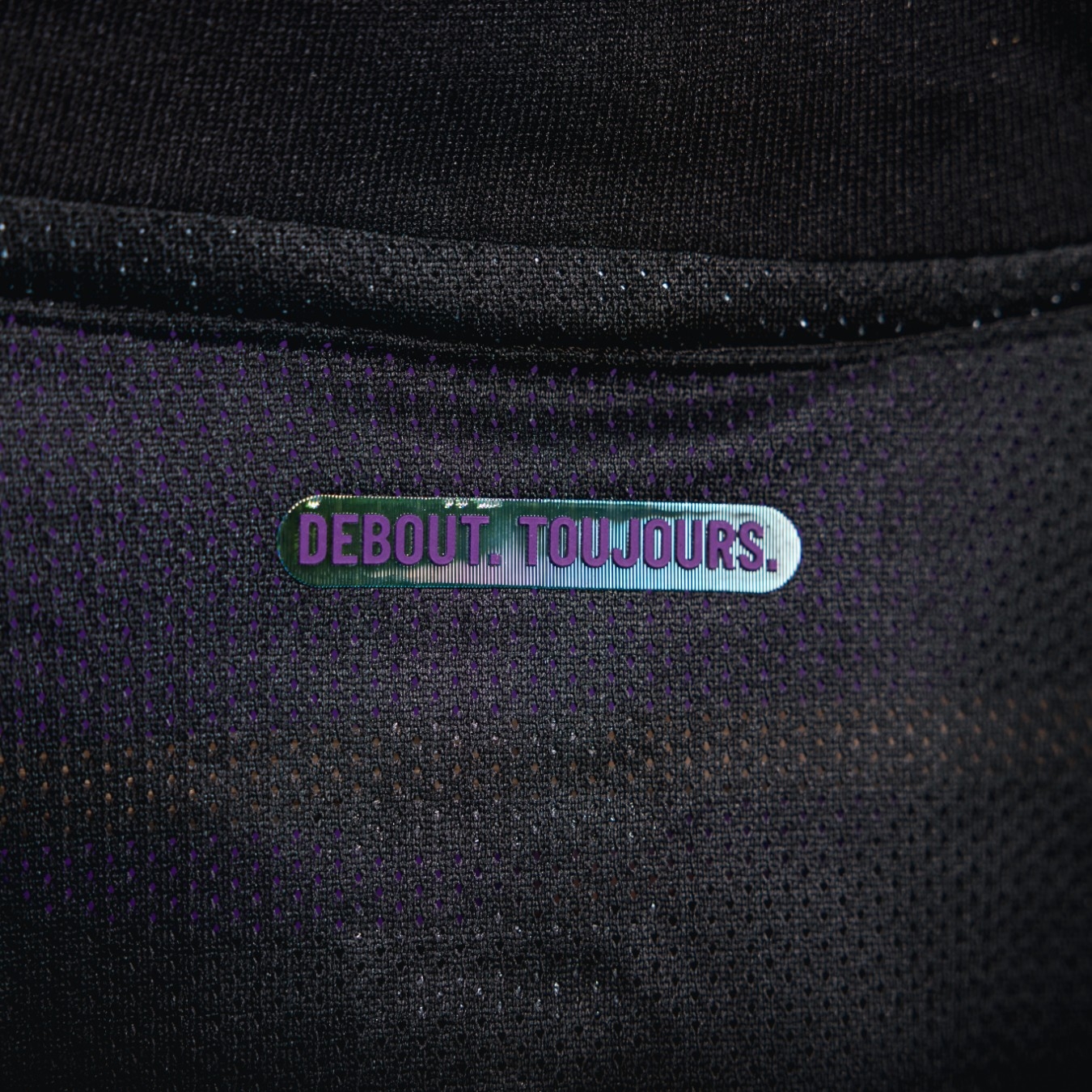 Featuring a rounded crew neckline, the shirt also incorporates a mesh back panel for added ventilation. The club motto “Debout. Toujours.” appears on an iridescent tab positioned at the upper back of the shirt, just below the neckline. Sleeve cuffs and side panels follow the black base to maintain consistency across the structure.