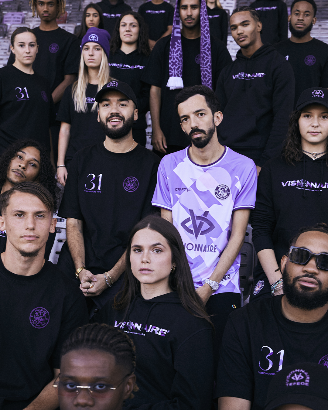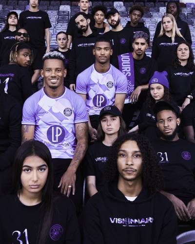 Designed by Toulousain rap duo Bigflo & Oli, and promoted featuring their "Visionnaire" brand logo as a “sponsor”, the violet-and-white 2022-23 secondary-change release carries heavy graphical embellishment.