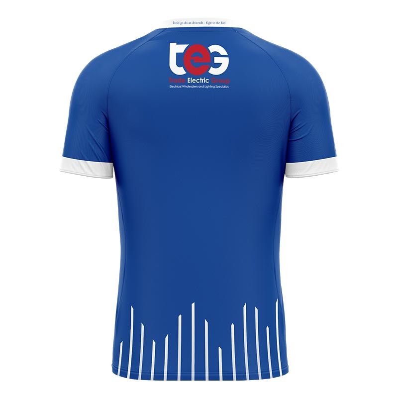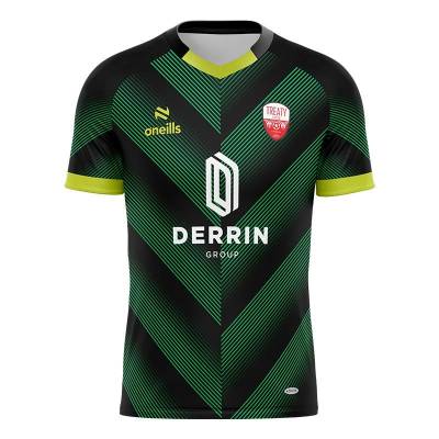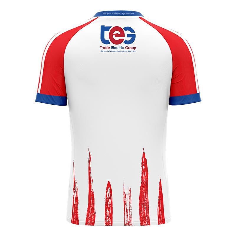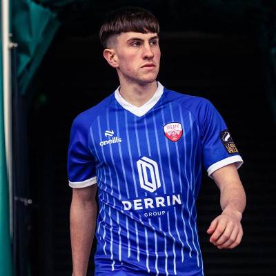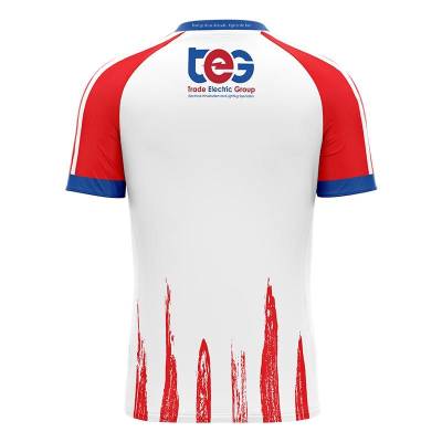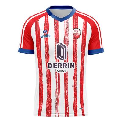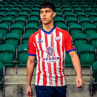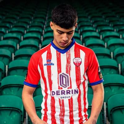 Produced by O’Neills, the Home shirt has red-and-white stripes in a painted/brushstroke style, the royal-blue Away is decorated with fading white stripes, and the Third has a heavily stylised chevron effect in green and black.