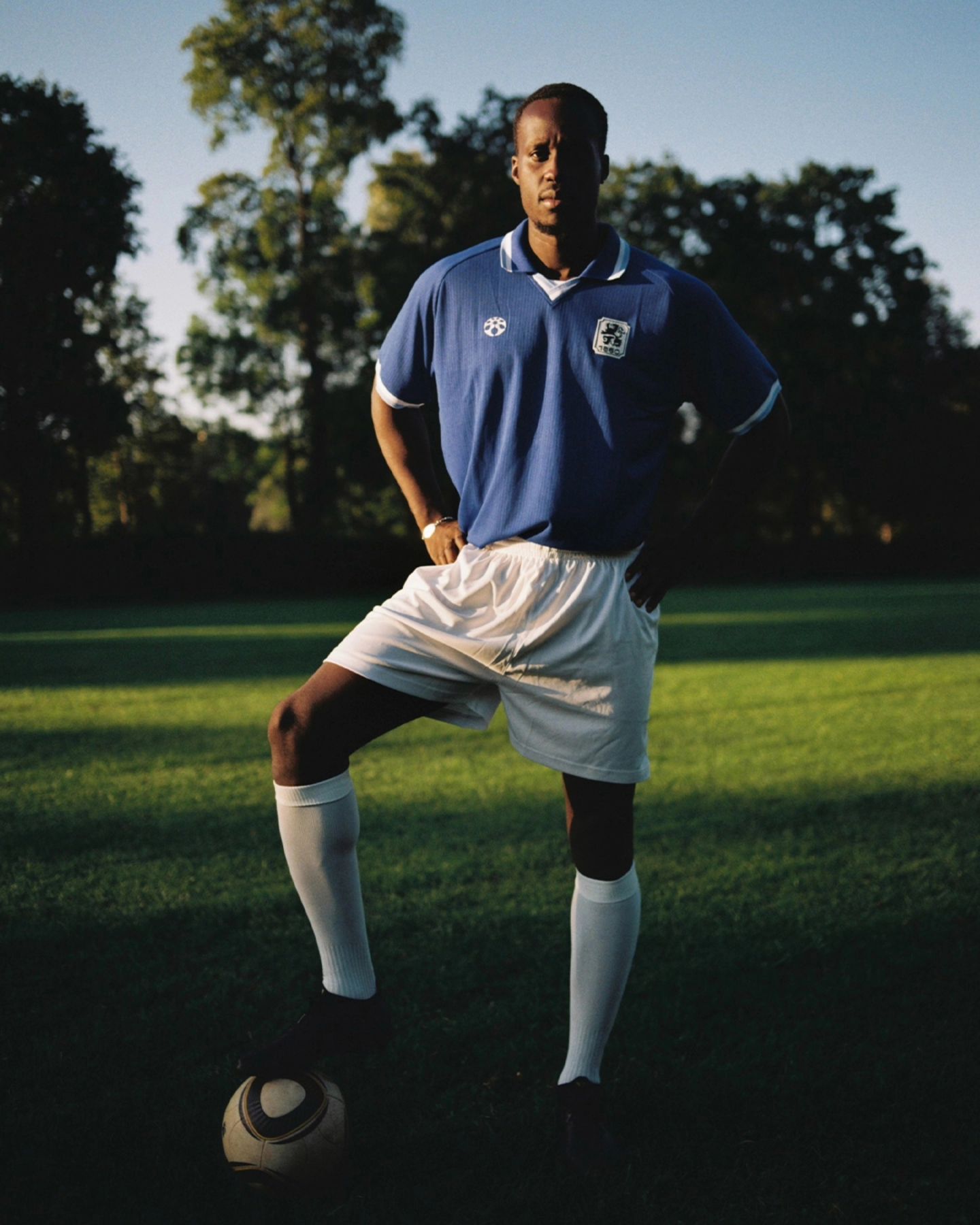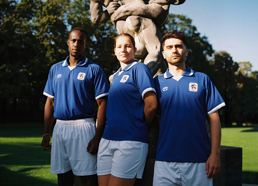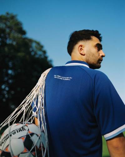 The collar and cuffs feature familiar sky blue, the crest is detailed on black on the white shield, and a white logo for the brand “Societas” takes up a position on the chest too, with the backward-looking design paying tribute to the backstory of a very famous side on Germany’s footballing landscape.