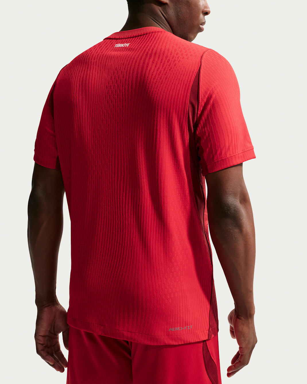 The new Turkey jersey is delivered in a Sport Red and Team Red colour combination with white detailing. The front features a tonal graphic that flows across the body, creating a layered surface effect through varied red shades. A horizontal chest band houses the Turkish flag at the centre, while the white Nike Swoosh is positioned beneath the flag.