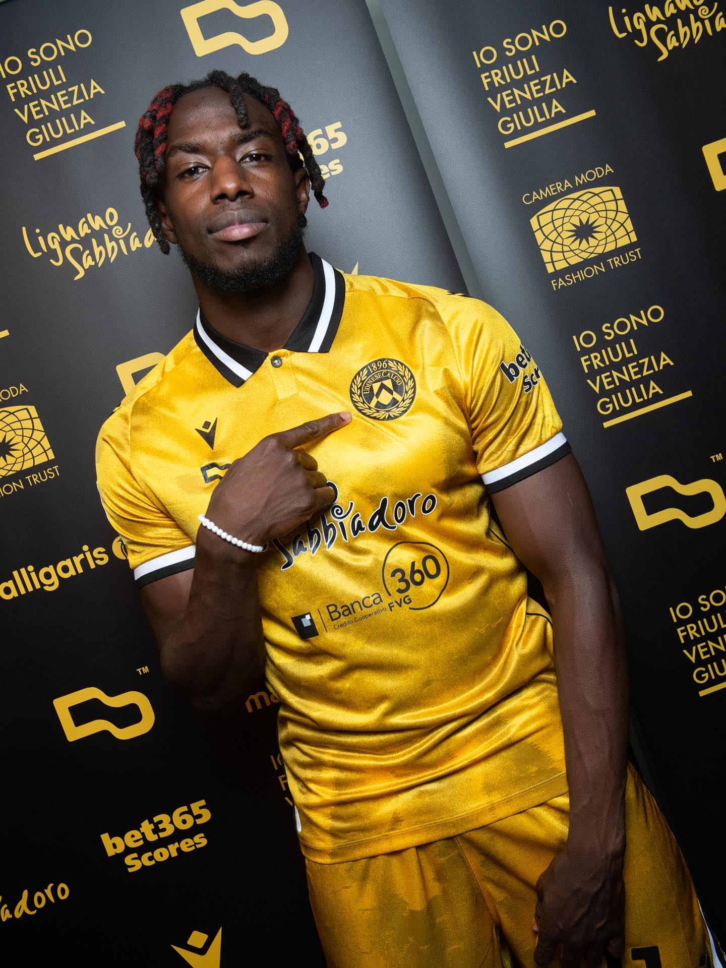 The shirt is presented in golden yellow, constructed in Eco Fabric made from post-consumer recycled plastic. Across the front and back runs a stylised eagle, a historic symbol of Udine and Friuli. The design is finished with a black and white polo collar and matching sleeve trim. On the chest, the Macron Hero sits above Orefice’s personal logo, with the Udinese crest applied on the opposite side. Inside the collar, a customised label combines the logos of Udinese, Macron and Orefice with the words “I Primi Bianconeri d’Italia”.