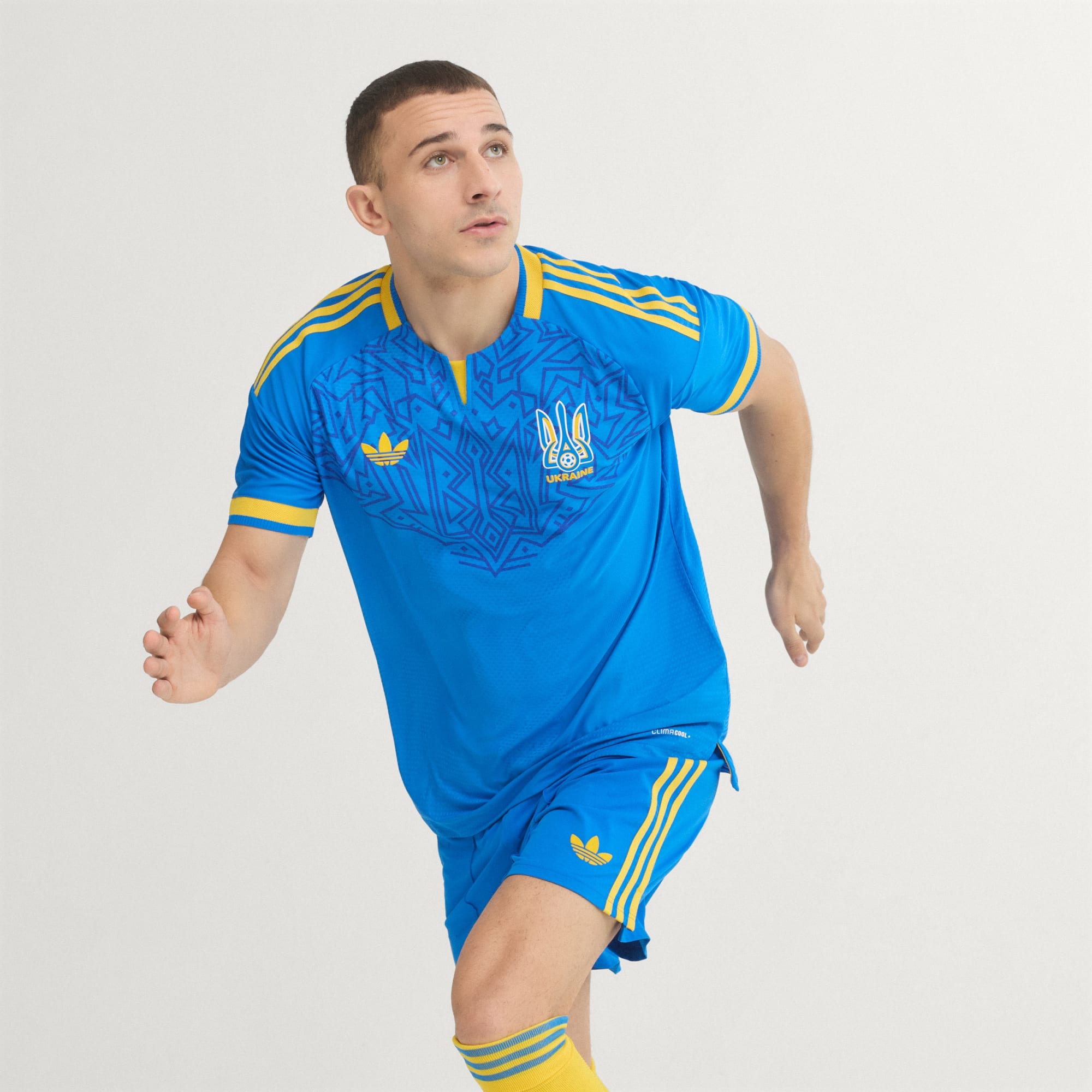 The new Ukraine football shirt is completed with matching blue shorts that include yellow adidas branding and stripes, along with yellow socks carrying additional 3 stripe branding, to form the full Ukraine 2026 Adidas Away Kit. It will be used during 2026-2027 competitions, including the 2026–27 UEFA Nations League campaign and UEFA Euro 2028 qualifying fixtures.