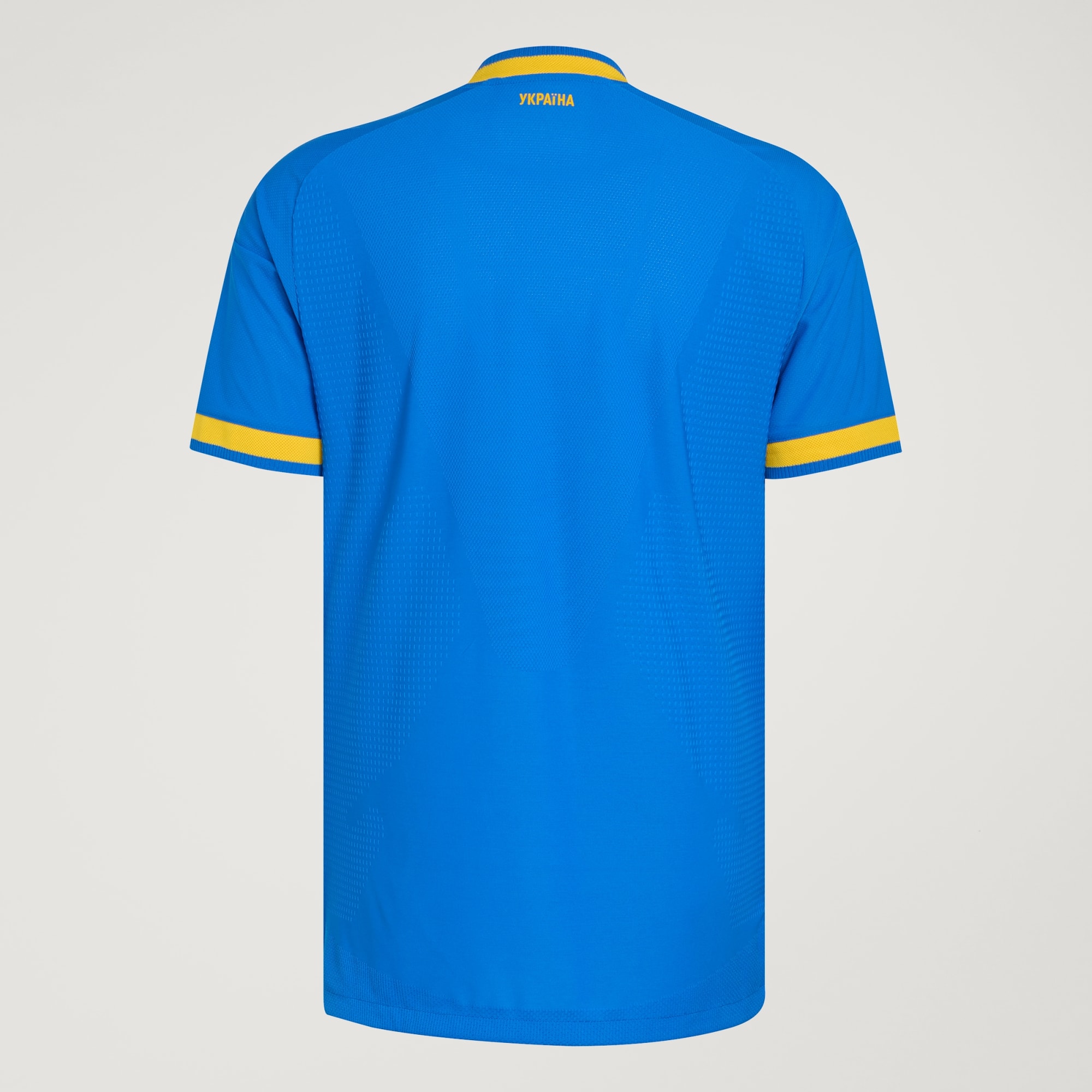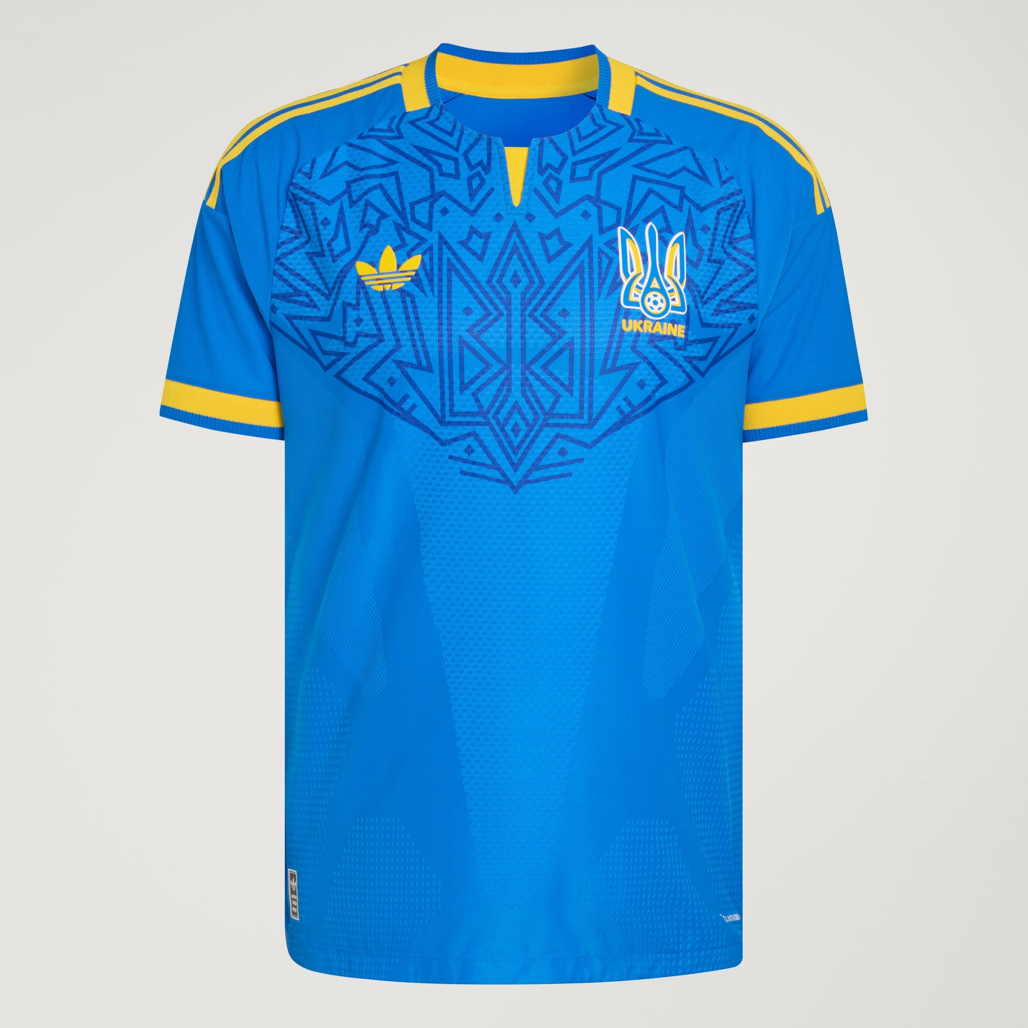 The new Ukraine jersey features a geometric pattern inspired by the Tryzub, the country’s national coat of arms, across the upper front panel. This sits beneath a centrally placed collar notch, with a ribbed neckline that incorporates yellow on the inner section. The adidas Trefoil logo appears on the right chest in yellow, paired with the Ukrainian Association of Football crest on the left, which includes a trident design with integrated football detailing and “Ukraine” text beneath.