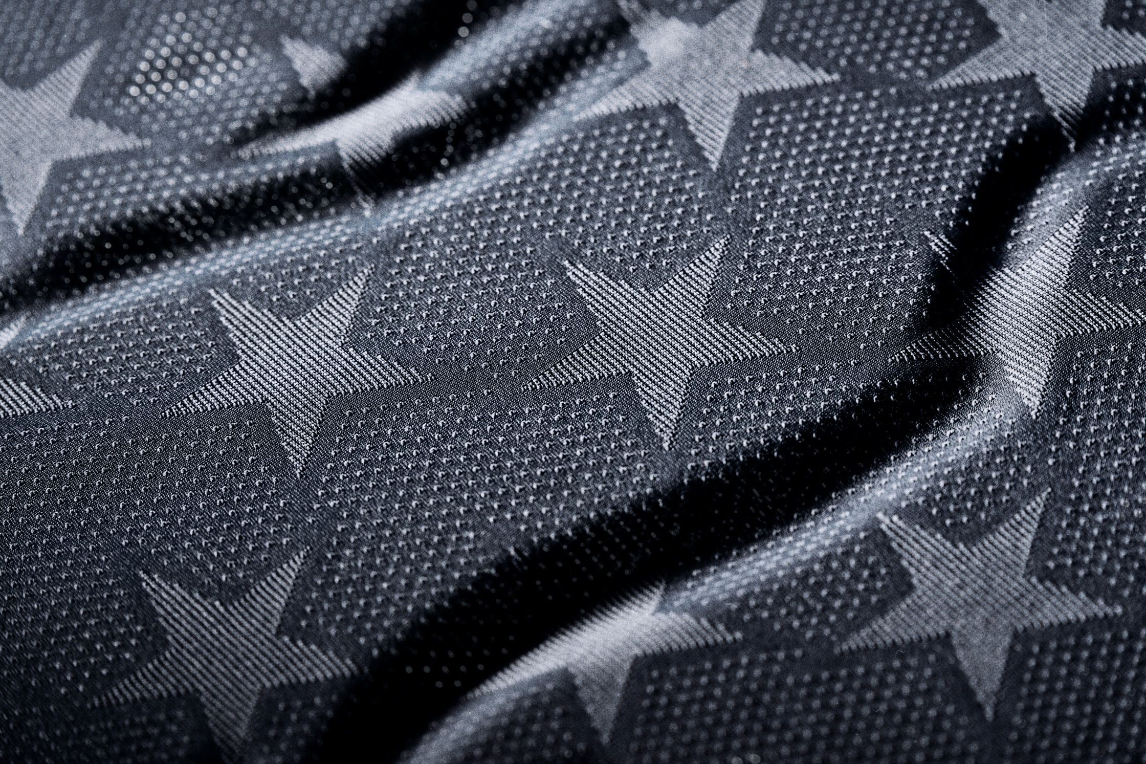 The new United States jersey features a Dark Obsidian base with a tonal star pattern integrated across the front panel and shoulders. The stars appear as a textured graphic within the fabric structure in Pure Platinum, referencing elements associated with the United States flag. Thin University Red piping details run along the shoulder seams and side panels, adding contrast to the otherwise dark colour scheme.
