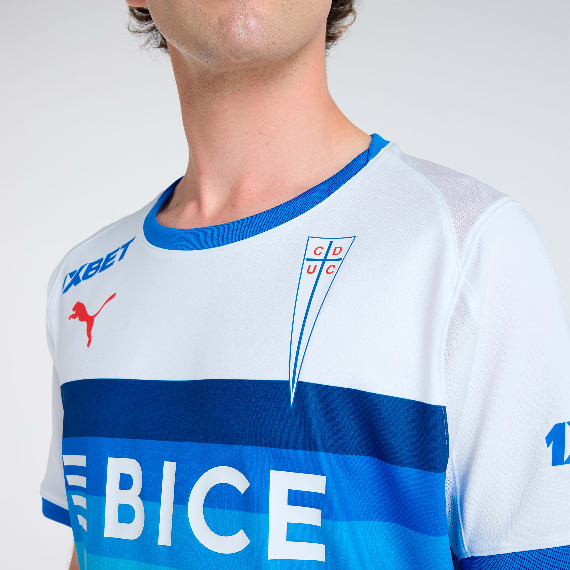 The Cruzados football shirt is built around a white base and features the club’s signature horizontal chest band in graduated blue tones. This central stripe is presented as a symbolic link between past, present and future, reflecting the idea of heritage passed down through families connected to Universidad Católica. The club crest is positioned on the chest in its modern shield format, while Puma branding appears opposite and on the shorts.