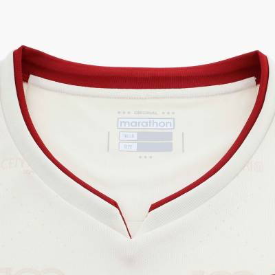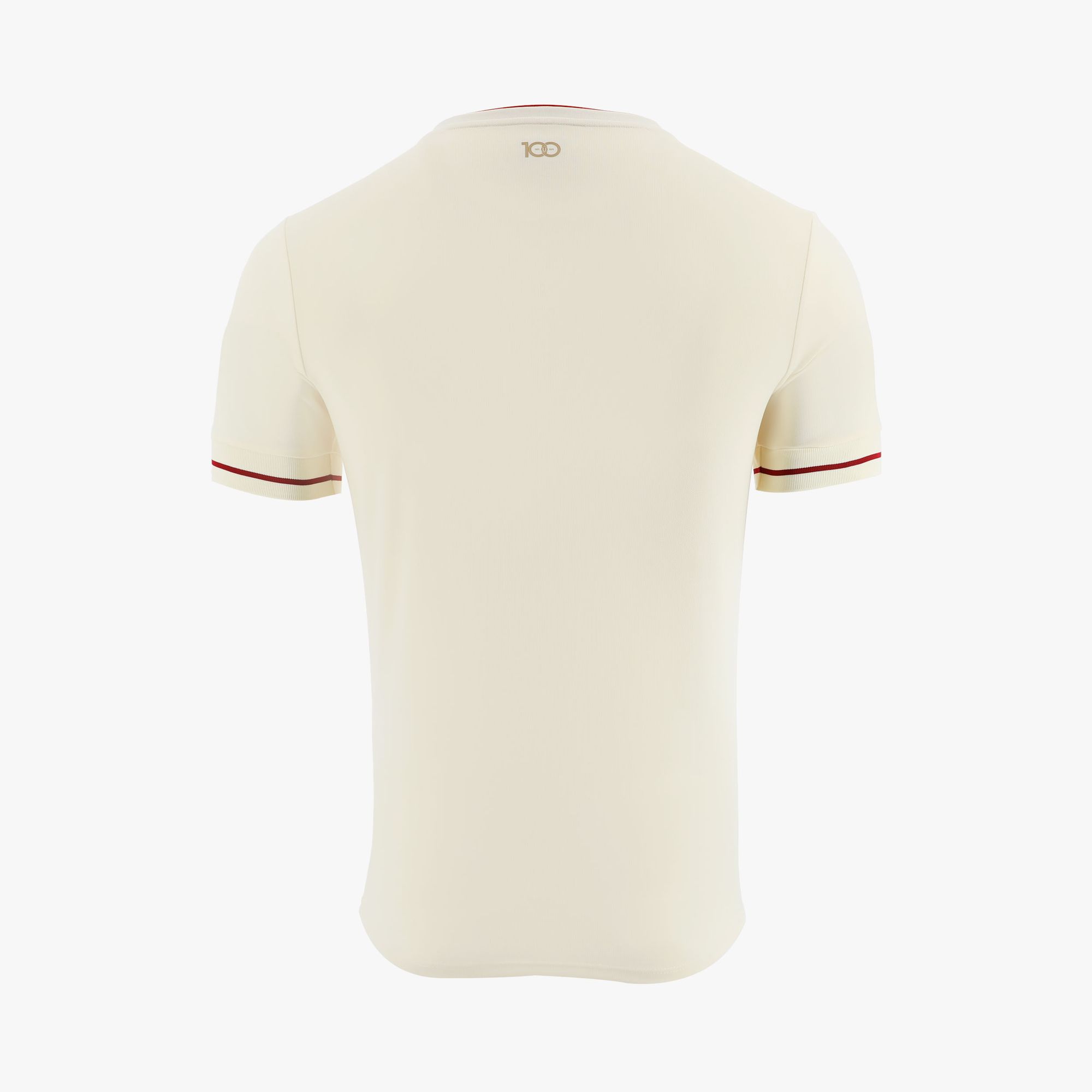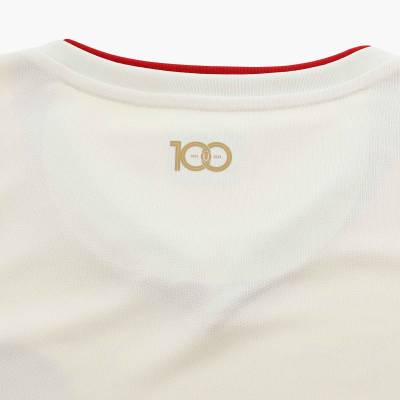 The design modernises tradition, with the collar and sleeve edges detailed in maroon, mirroring the club's iconic colours. A special touch is the centenary seal positioned at the bottom of the badge, marking the club's milestone.