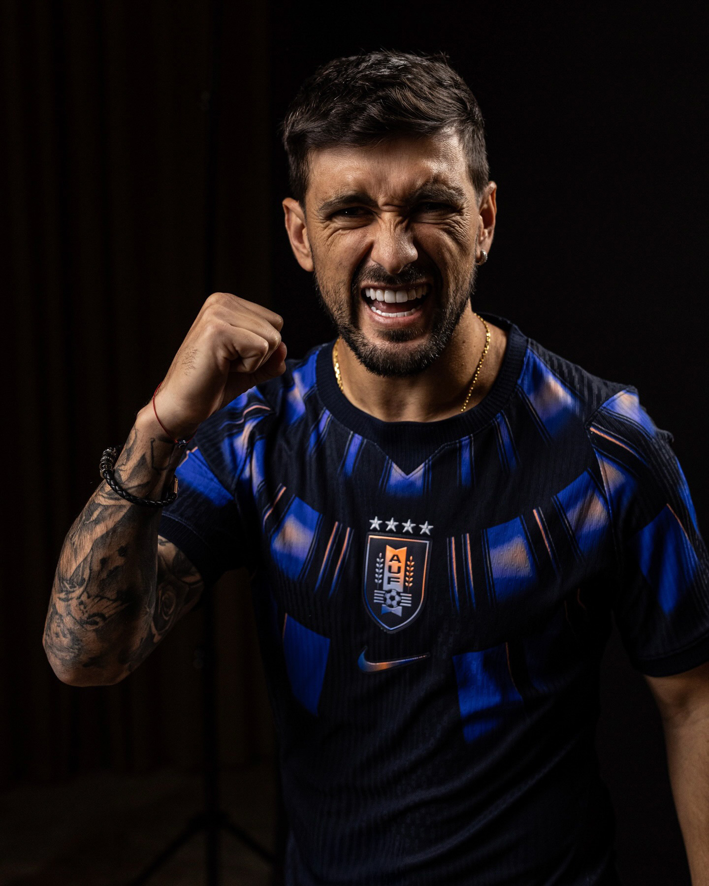 The new Uruguay jersey features a Obsidian base with integrated graphic elements inspired by the architectural identity of Montevideo. The visual structure references Art Deco influences found across the city, with specific nods to the Estadio Centenario and the Torre de los Homenajes. Across the upper chest and shoulders, a series of geometric light-based shapes are applied, drawing from the tower’s window formations and the way light interacts with its concrete structure.