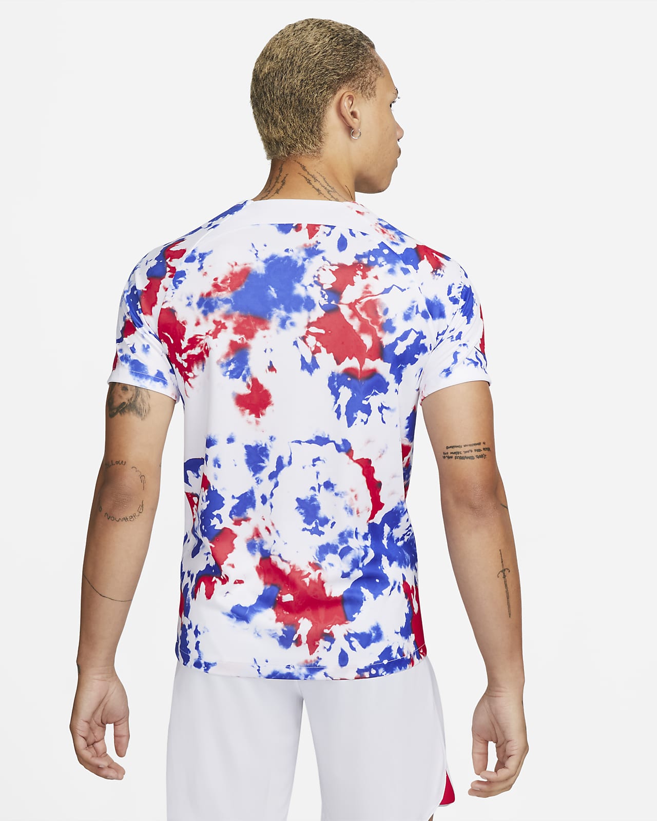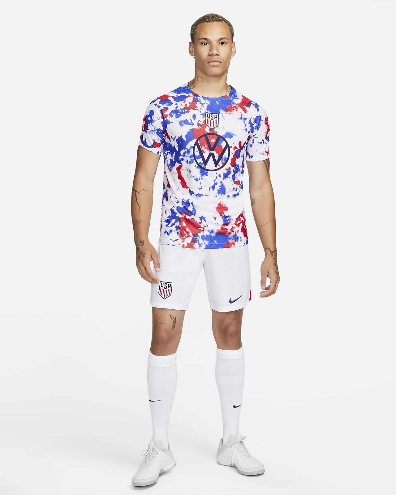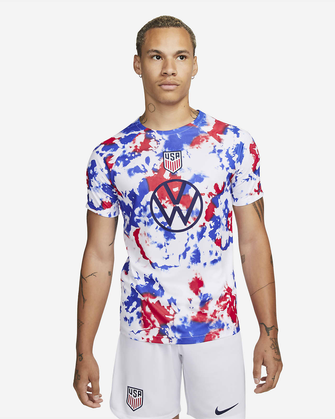 The warmup top for the United States Men’s National Team (USMNT) boasts Dri-FIT technology and features a bold pattern - red and “Loyal Blue” - on the white base, while this overlaid with the US’s international side’s crest, centrally, above the logo of sponsor Volkswagen (VW), and the supplier’s Swoosh logos appear on the sleeves.