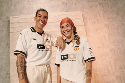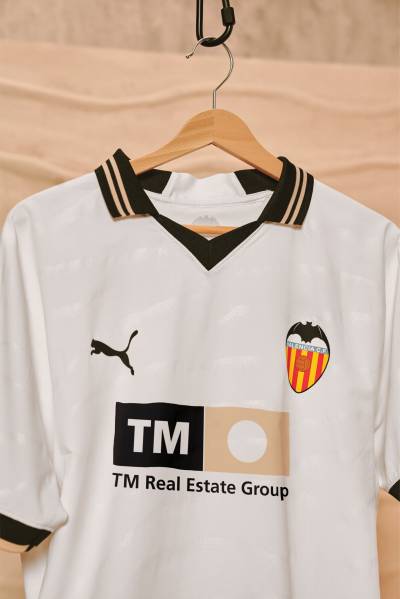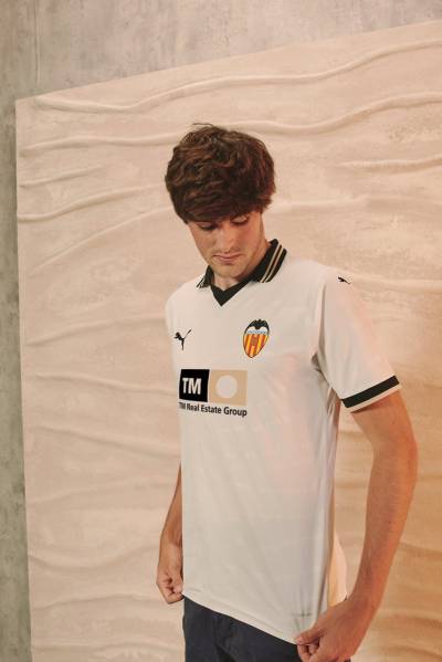 The 2023-24-season primary design is in white with black and a sand tone - perfectly matching the main sponsor’s branding - and a dune-styled jacquard which together is intended to be a tribute to the people of Valencia and the city’s standing as a beach resort on the Mediterranean Sea.