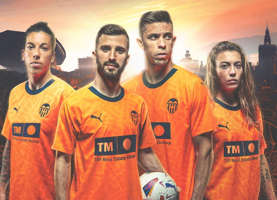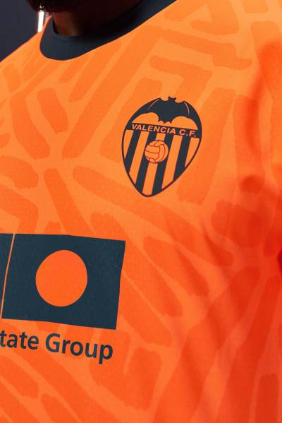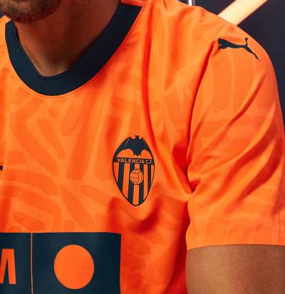 The new supplementary change from Puma is in orange and has a pattern that is marketed as referencing the streets around the club’s famous Mestalla Stadium - to signify the relationship with the supporter base and city - and embellishment beyond this is in navy blue.