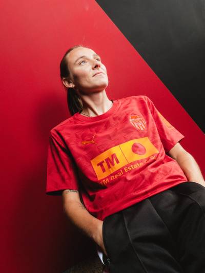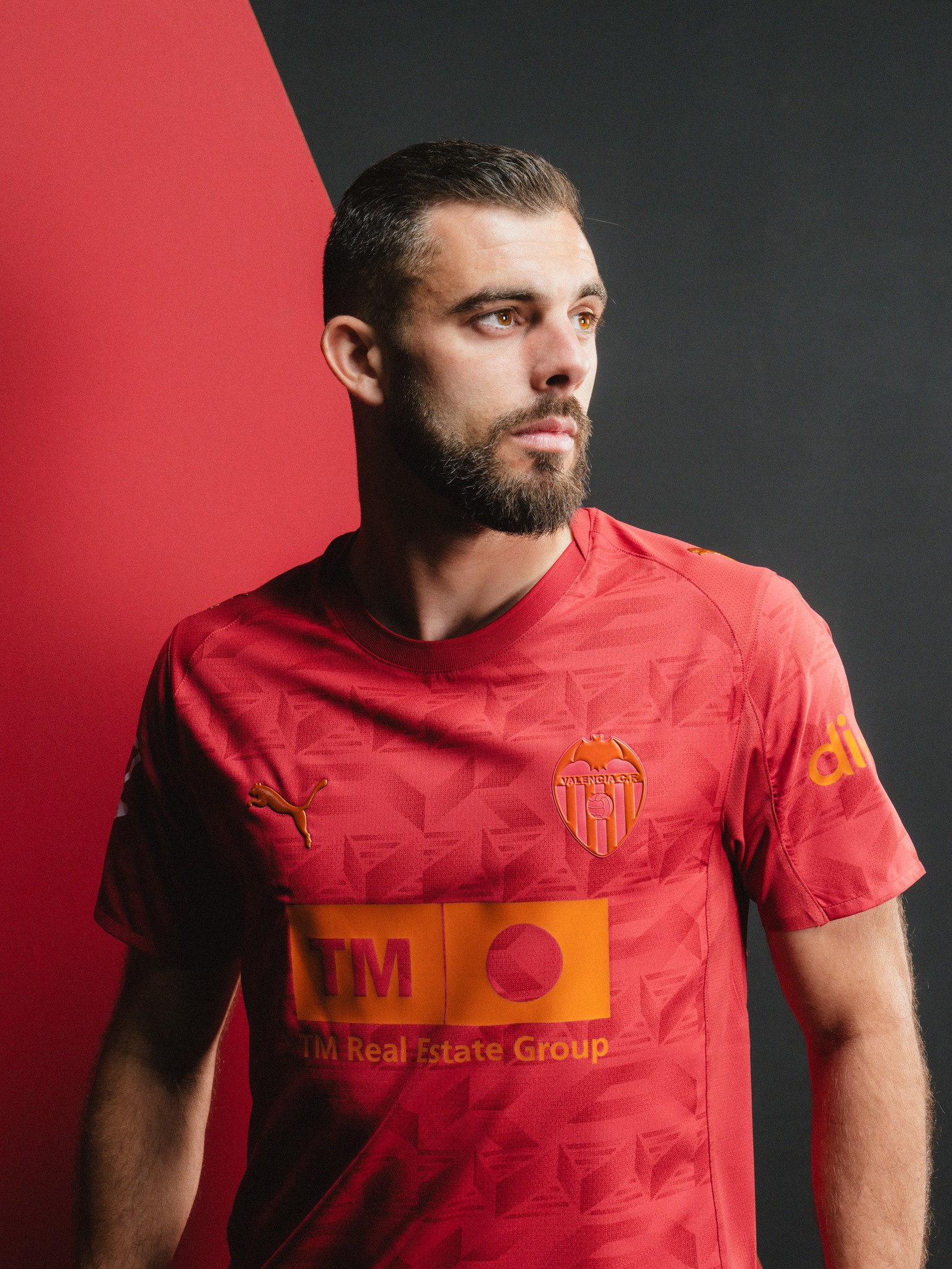 Sponsor TM Grupo Inmobiliario appears on the front, while Divina Seguros is displayed on the left sleeve. Both logos, along with other details, are presented in Mediterranean Orange, a colour introduced by the club to mark a new era and inspired by the city’s sunset tones and Mediterranean heritage.