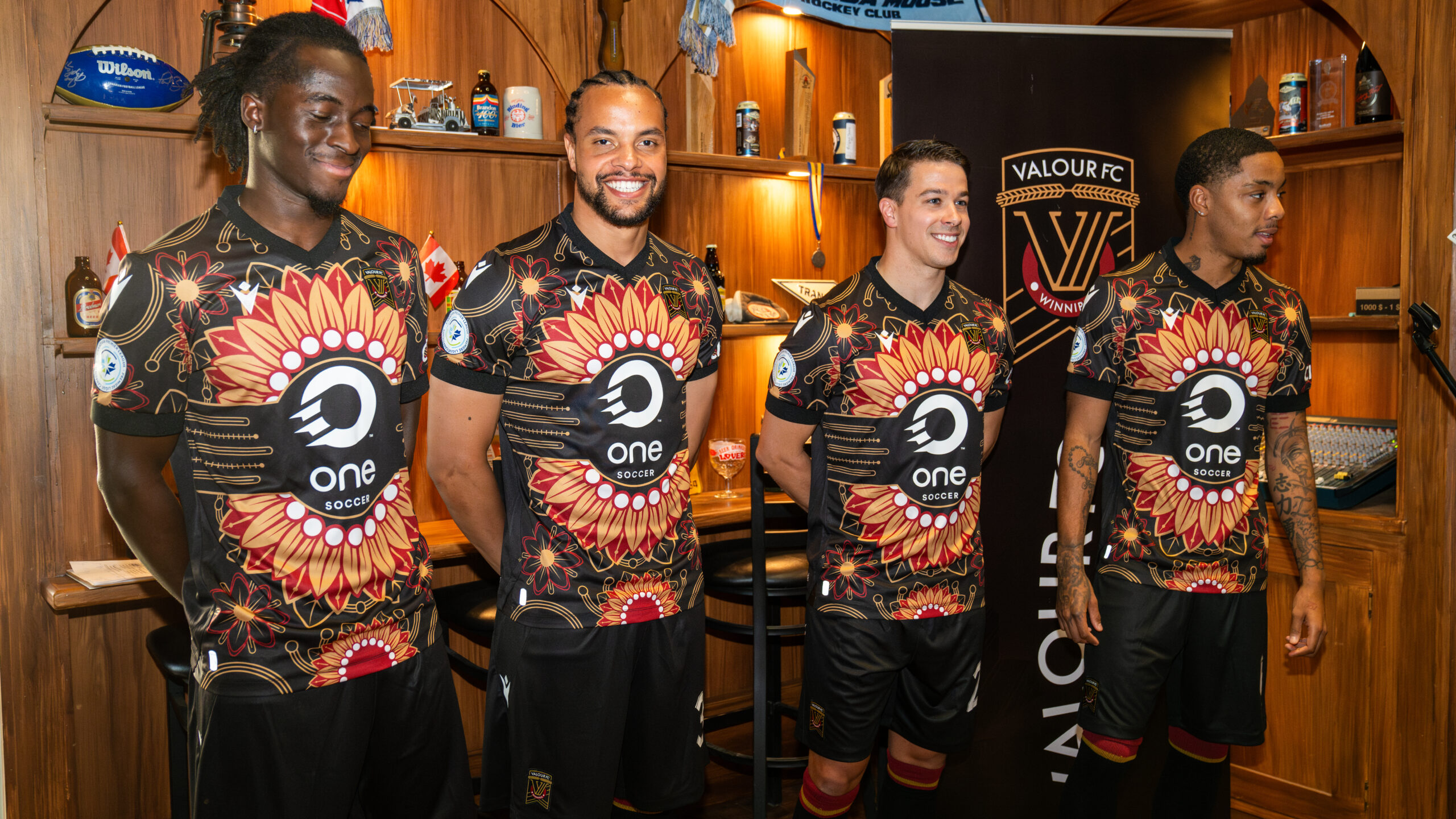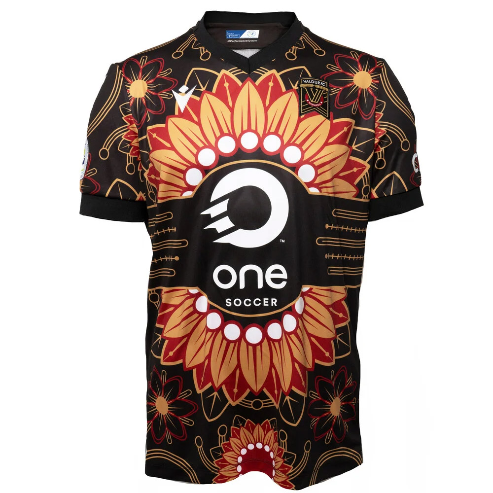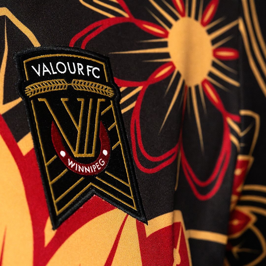 Nominally built on a black base, the 2024 “Secondary”/“Alternate” design for the Winnipeg-based Canadian Premier League side features a rendering of a sunflower (“ziinda`aagan”) writ large and prairie crocuses, both and together nods to the Indigenous “First Peoples” of the country.