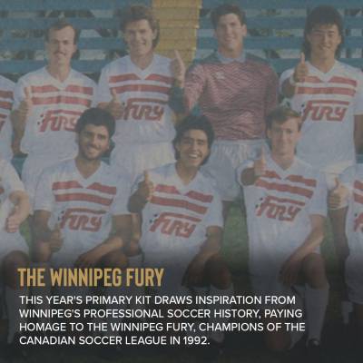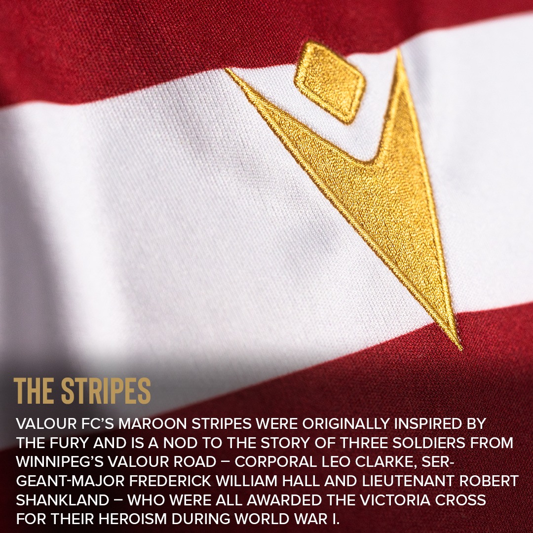 In white with maroon stripes - which references the look of Valour FC’s forerunning “Winnipeg Fury” side - the new Macron release’s styling is a tribute to Corporal Leo Clarke, Sergeant-Major Frederick William Hall and Lieutenant Robert Shankland, the three recipients of the Victoria Cross who lived on Pine Street and who provoked the thoroughfare’s name change to “Valour Road”.