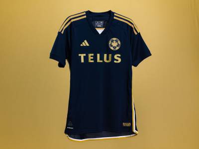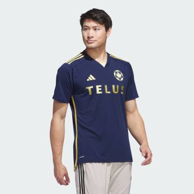 It sports navy blue as the primary colour, complemented by gold trim accents, symbolising the club's golden anniversary, alongside branding from their prime partner, TELUS.