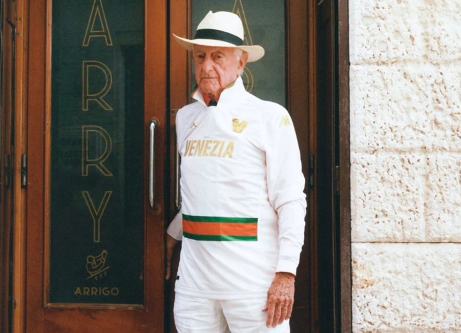 This orange-and-green element, which nods to shirts from the 1990s, ties in with the cuffs and collar, while the logos and “CITTÀ DI VENEZIA” legend are in gold and the kit will be completed with complementing shorts and socks.