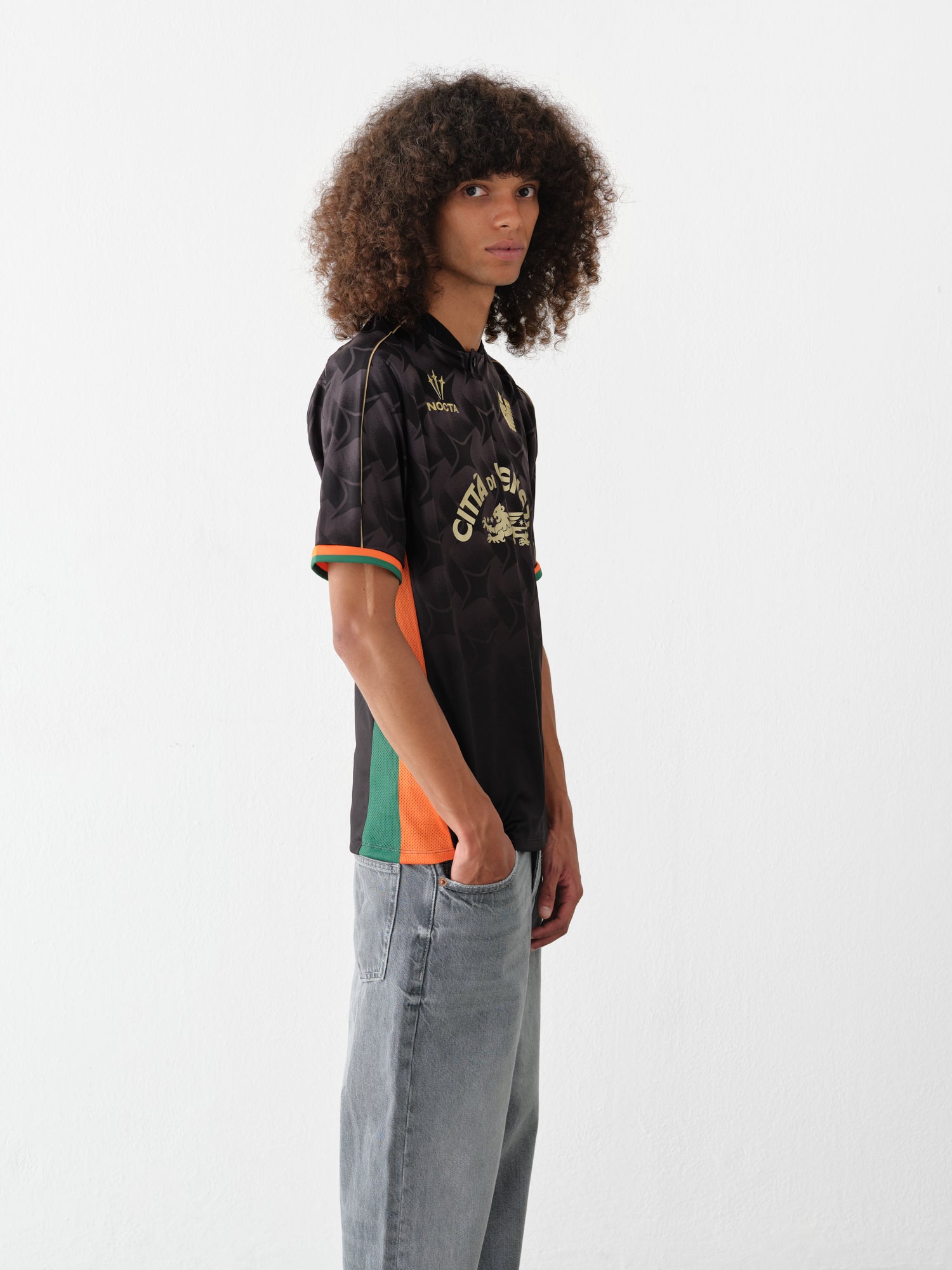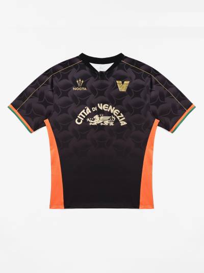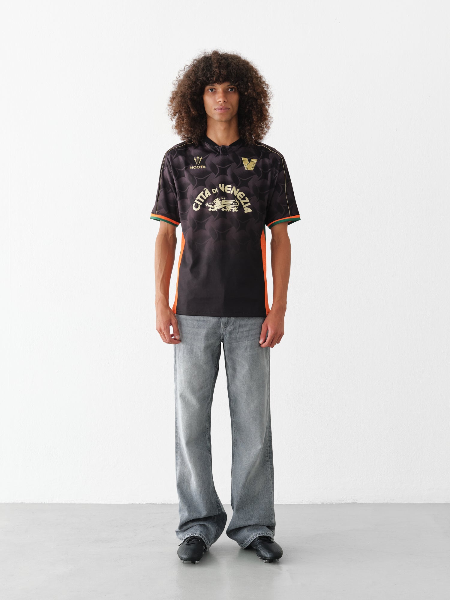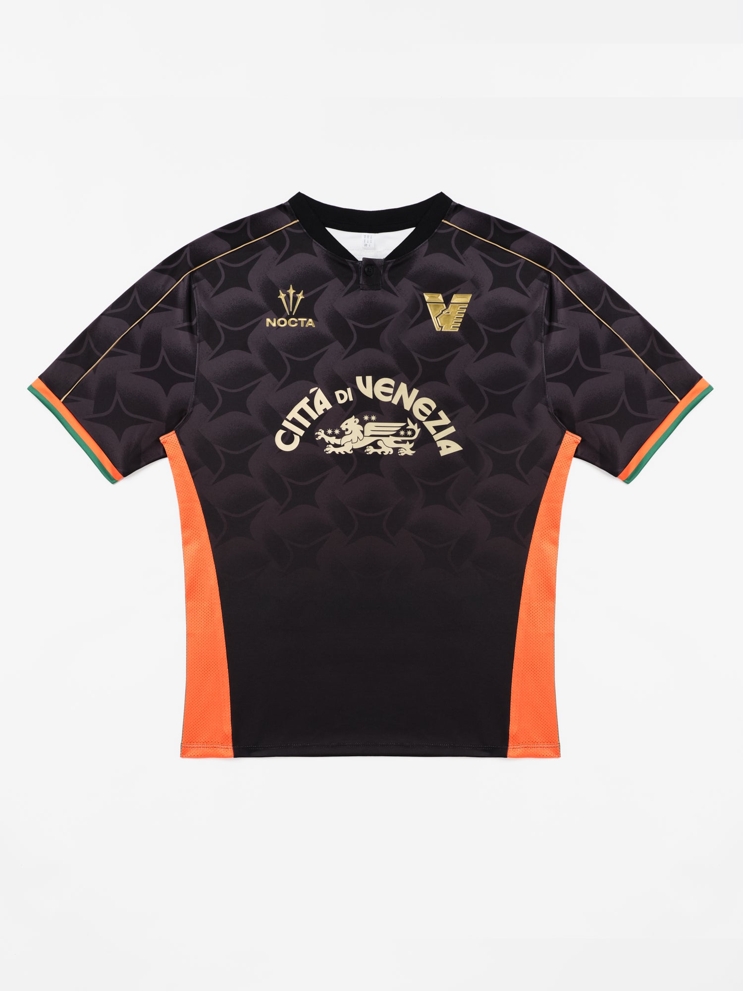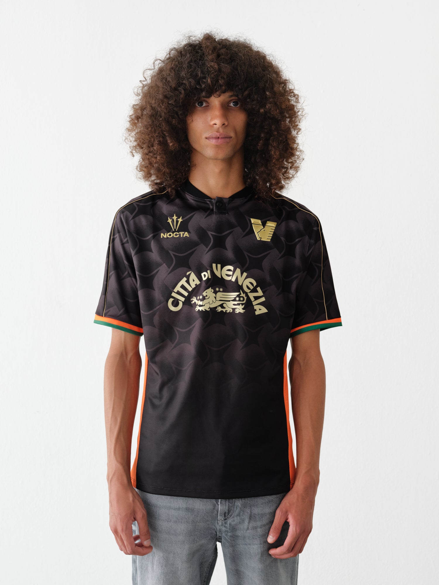 The design is predominantly black, featuring a geometric star-shaped pattern across the fabric, reflecting Venice’s iconic night sky. Gold accents highlight the shirt, including the Venezia crest and NOCTA branding on the chest.