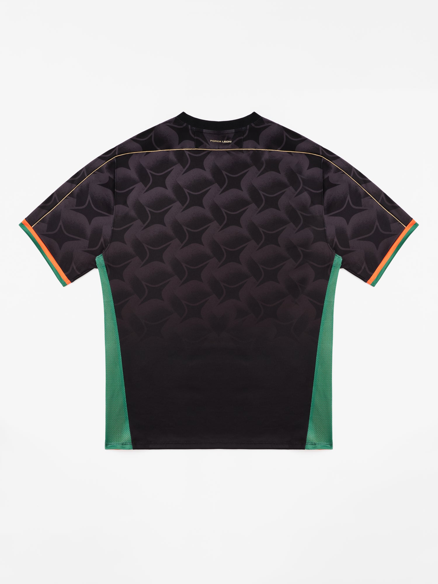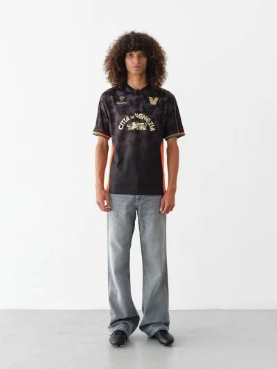 The shirt includes a black buttoned collar and green and orange cuffs, representing Venice's colours, with orange and green mesh panels running along the sides. The kit is paired with black shorts and socks, complemented by orange and green accents.