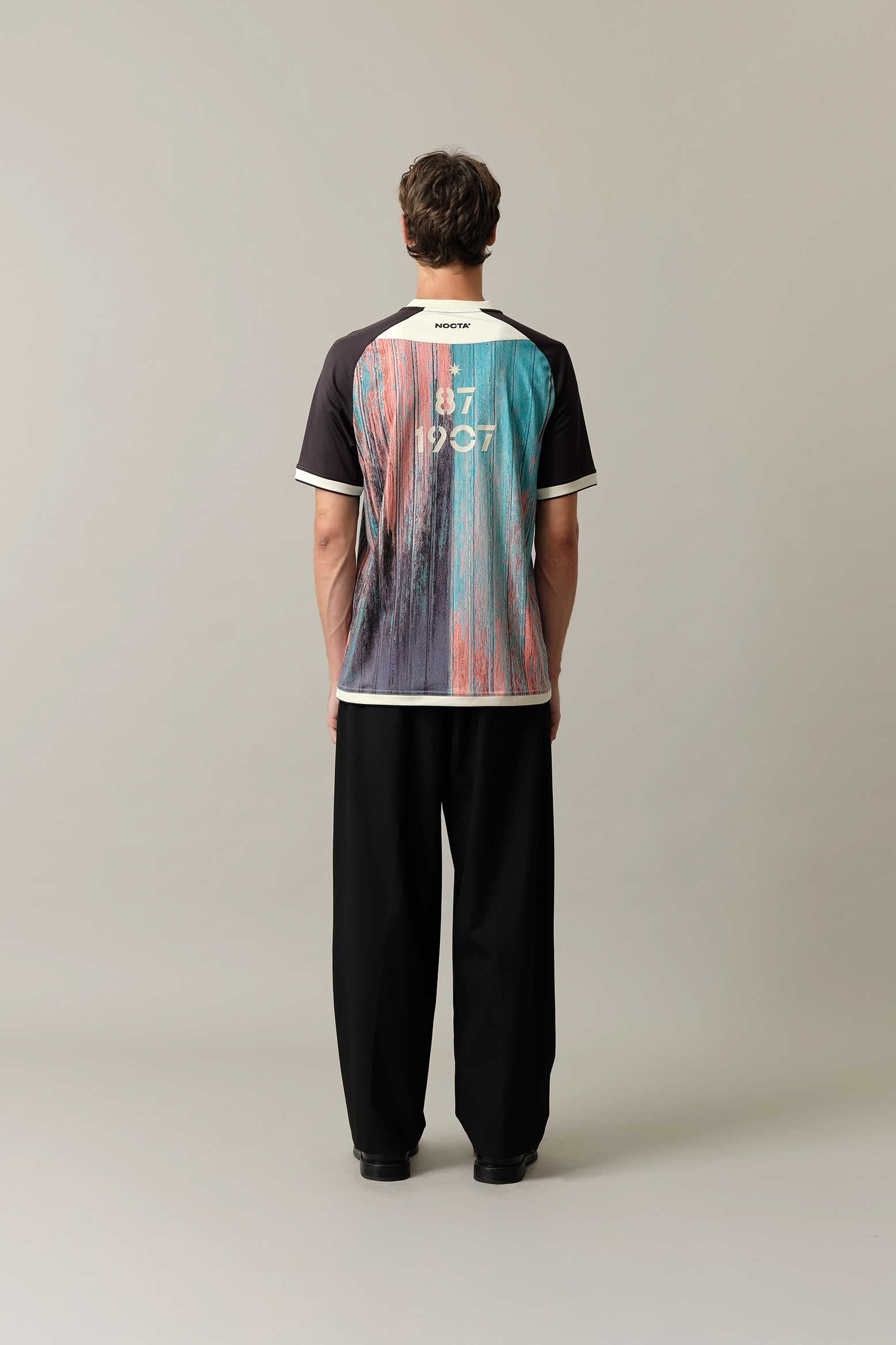 The shirt features a multicoloured graphic pattern in shades of turquoise, coral, and charcoal across the front and back, contrasted by black raglan sleeves and ivory trim. The Venezia FC crest and NOCTA branding appear on the chest, while the numbers 1907 and 87 on the back reference the club’s foundation and the 1987 merger with A.C. Mestre, a key moment in Venezia’s history.