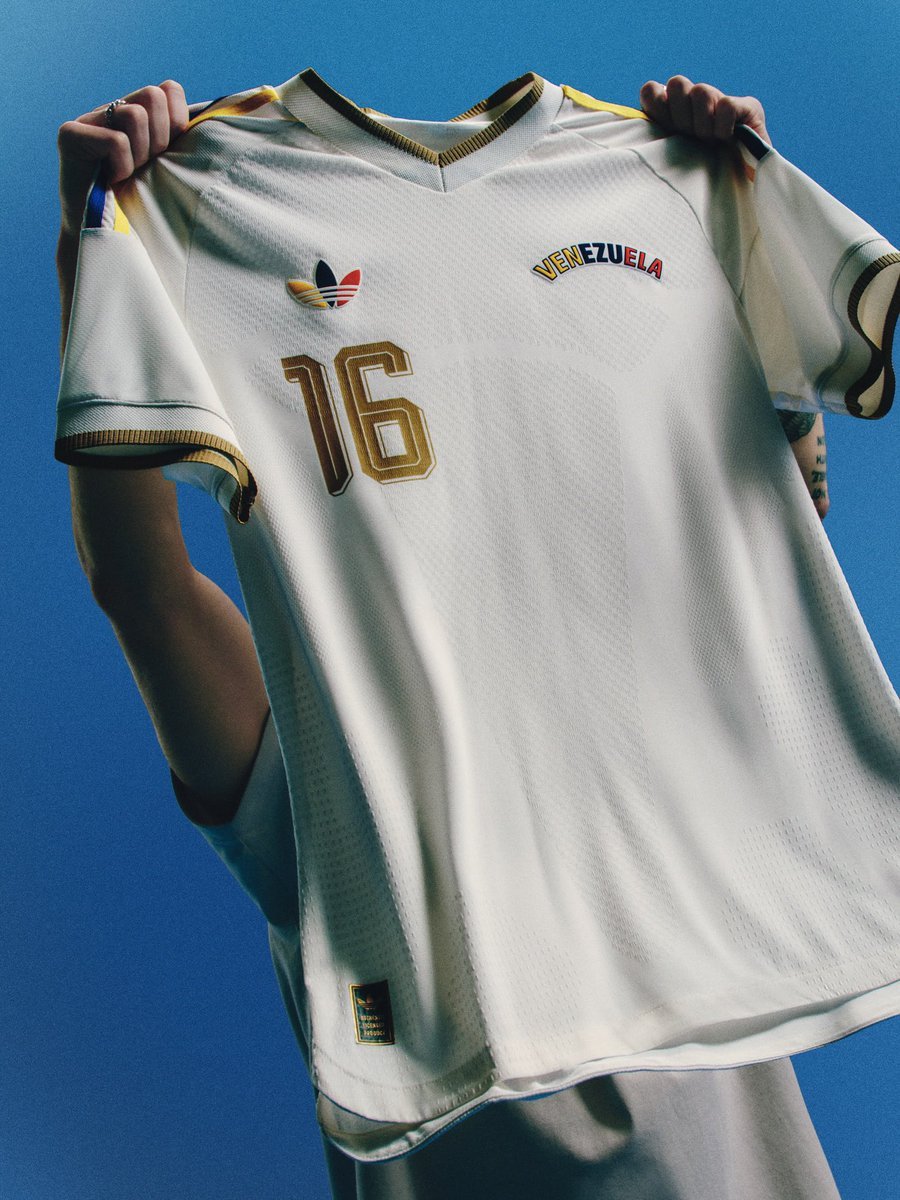 The new Venezuela jersey has a Cloud White base with a ribbed V-neck collar and matching sleeve cuffs, both finished with gold trim. Running along the shoulders are adidas three-stripe details in yellow, blue and red, bringing the national colours into the design in a restrained way. On the chest, the adidas logo also carries the same tricolour treatment, positioned opposite a curved “Venezuela” shield-style badge on the left side.