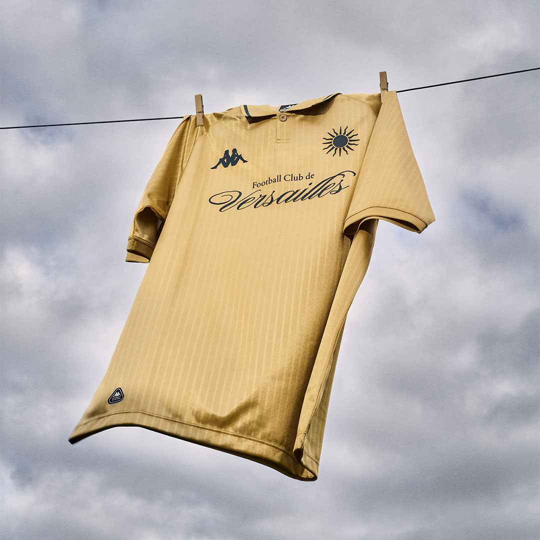 The FC Versailles football shirt continues the gold theme associated with Versailles, presented in a polo style with short or long sleeve versions. The shirt features a vertical tonal pattern woven into the fabric, while the front displays the full “Football Club de Versailles” wording with the prominent Versailles script placed centrally. Navy detailing is used for the collar trim, the Kappa Omini logos on the chest, and the sun symbol that has become a recognised signifier of the team.
