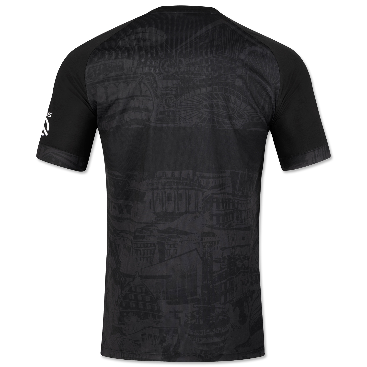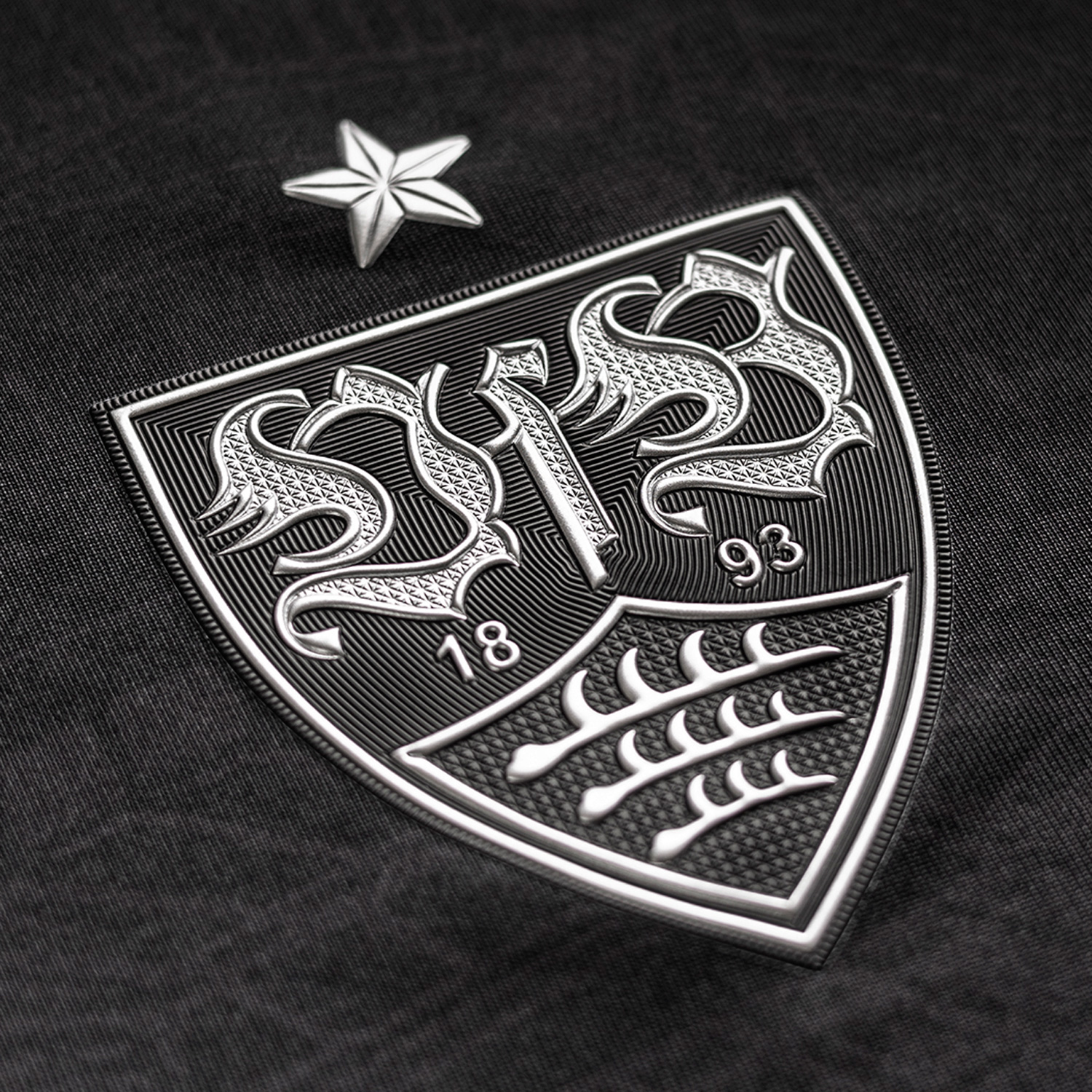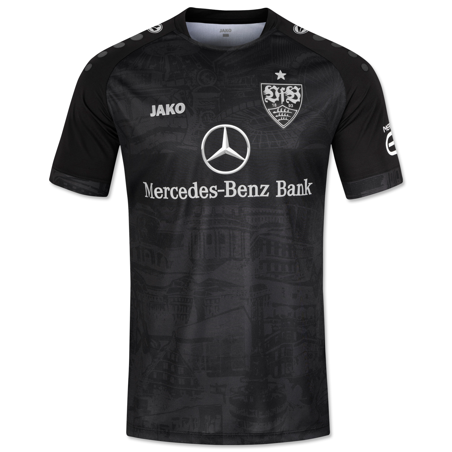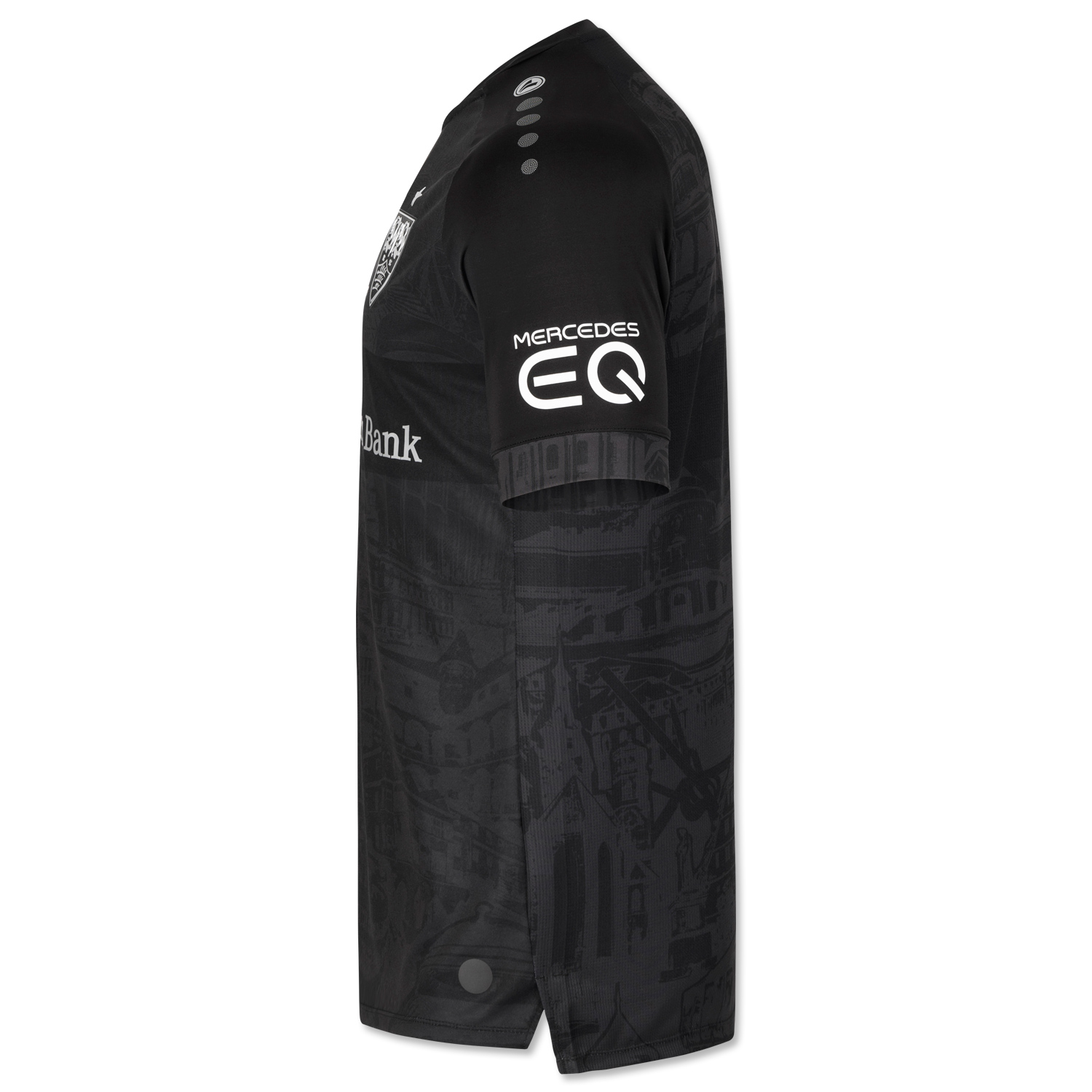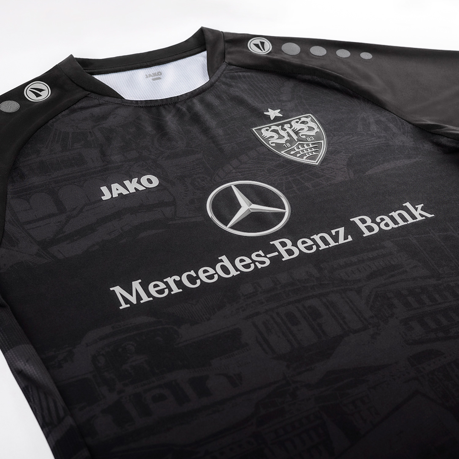 The monochrome secondary-change release from Jako features a mural-style collection of Stuttgart city landmarks on the trunk, above and beneath the famous chest band which appears tonally.