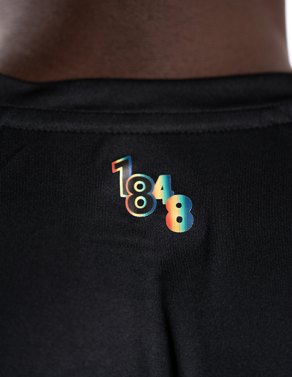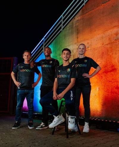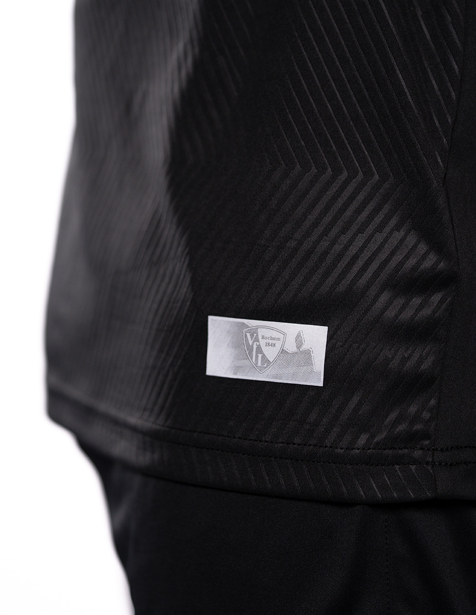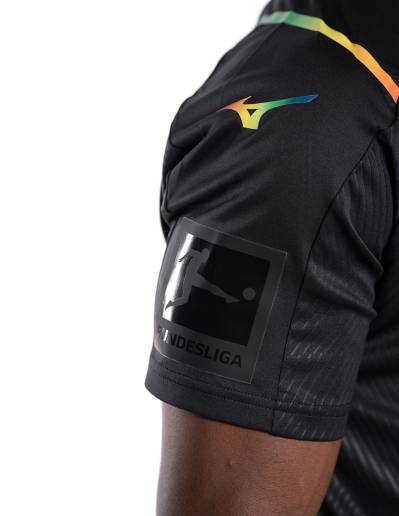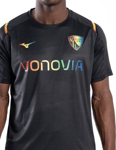 The jersey is completely black, while the sponsor lettering, jersey details and the VfL logo shine in rainbow colours.