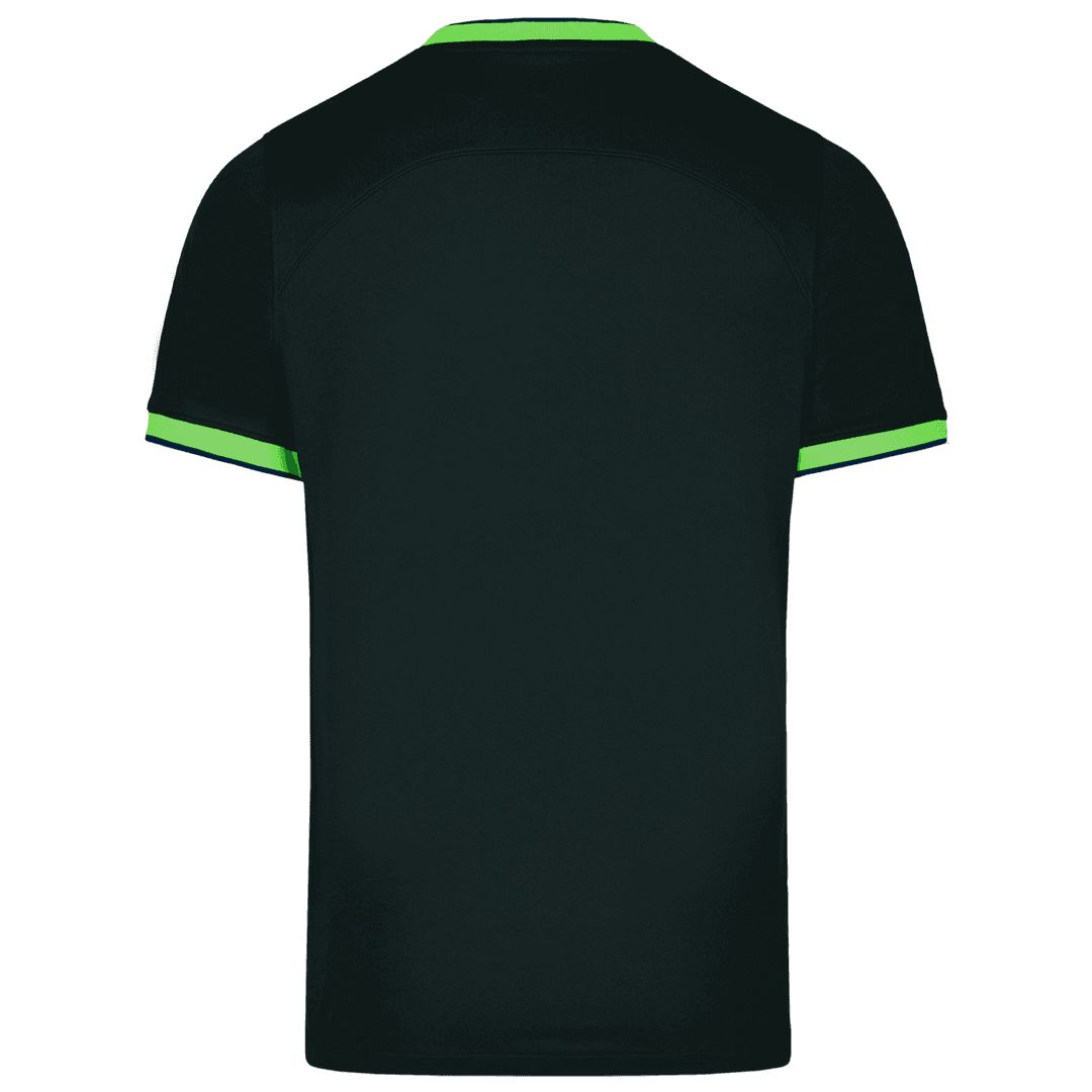 The 2022-23 design is in dark grey with green embellishment, including the simple crest.