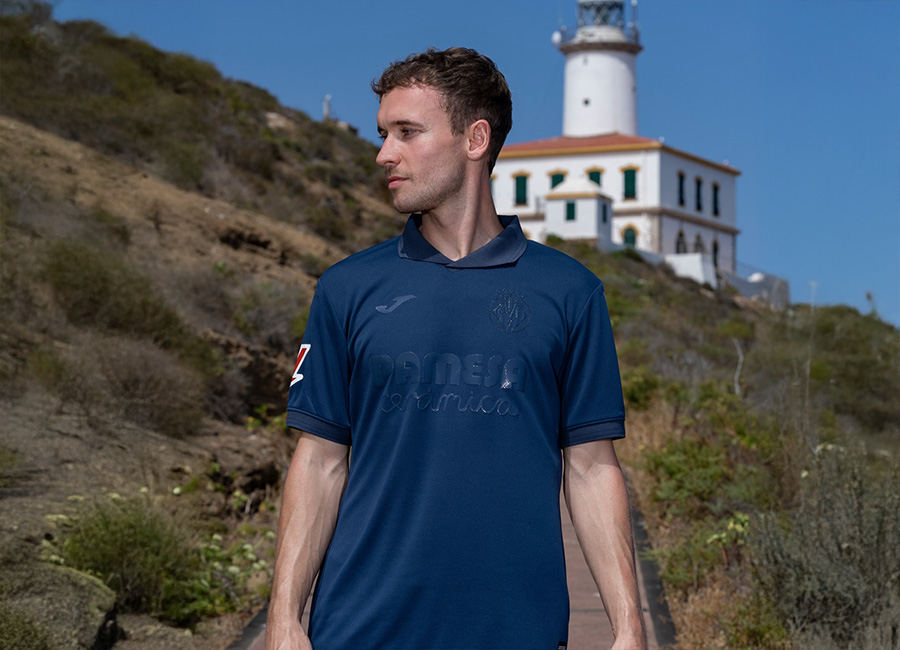 The design takes inspiration from the Mediterranean Sea and the Columbretes Islands, using tonal deep navy blue across the shirt, shorts and socks, including the club crest and sponsor logos.
