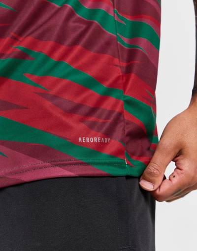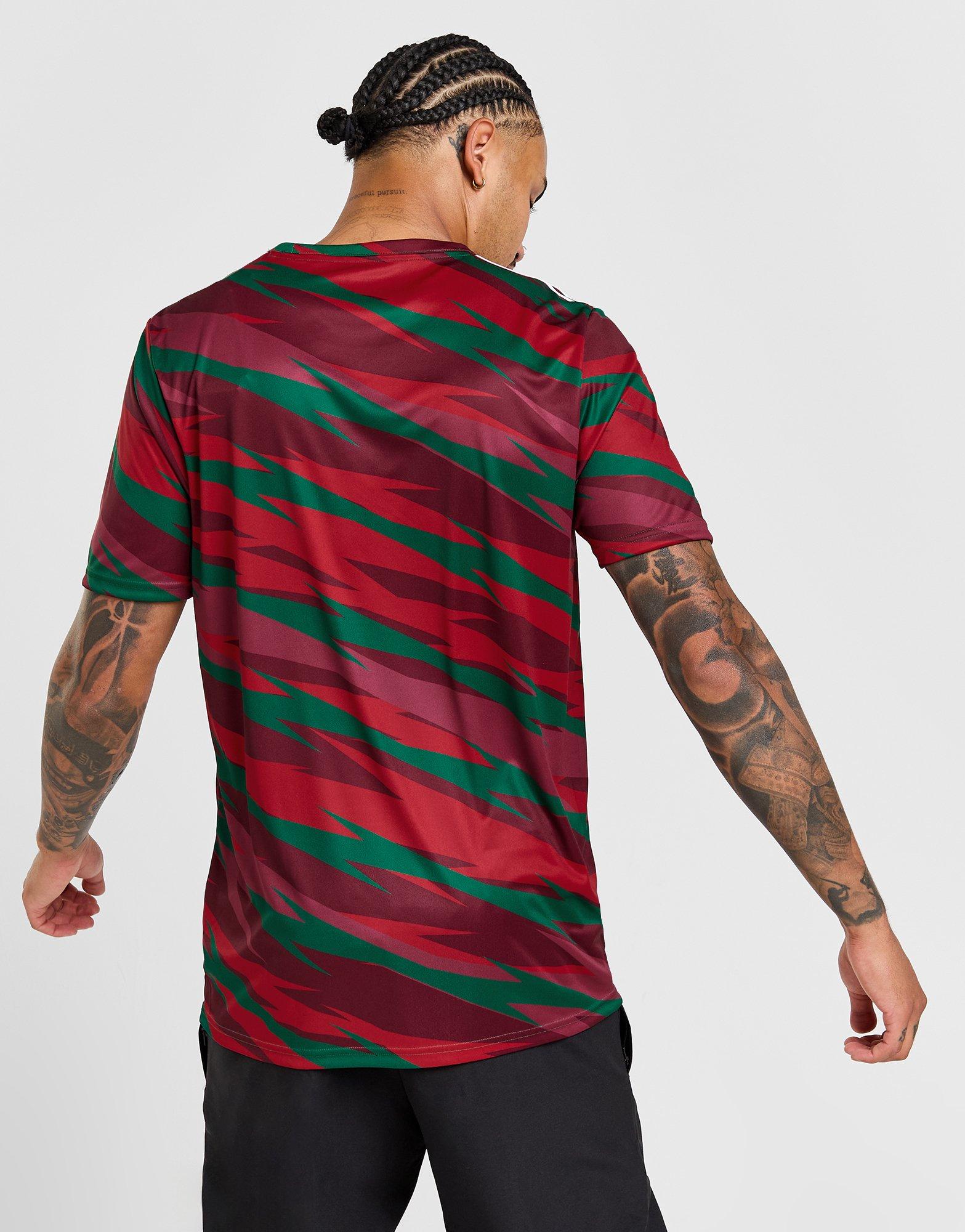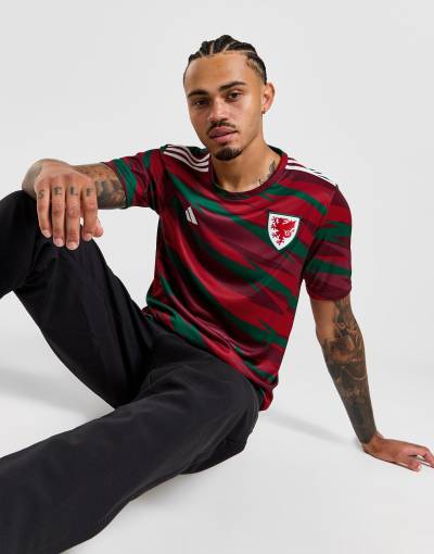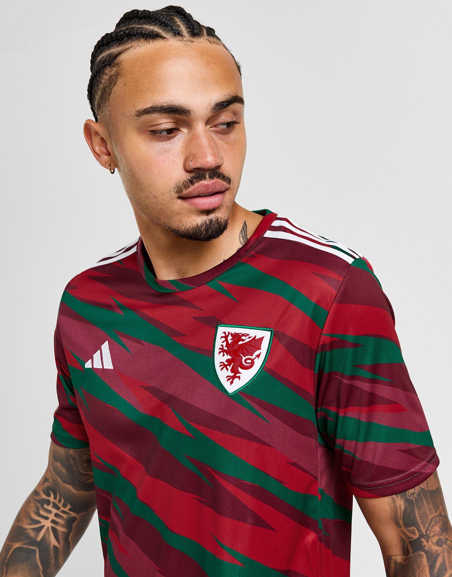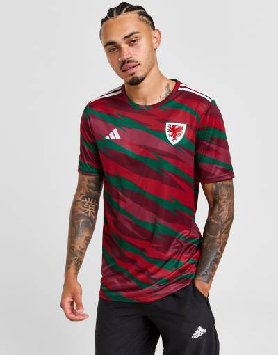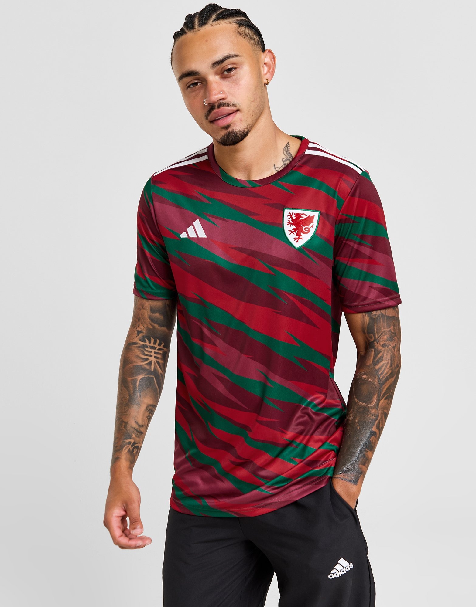 The 2024 warmup top for the Football Association of Wales (FAW) representative side features tones of red/purple with green in a striking pattern and the branding of supplier adidas appears in white.