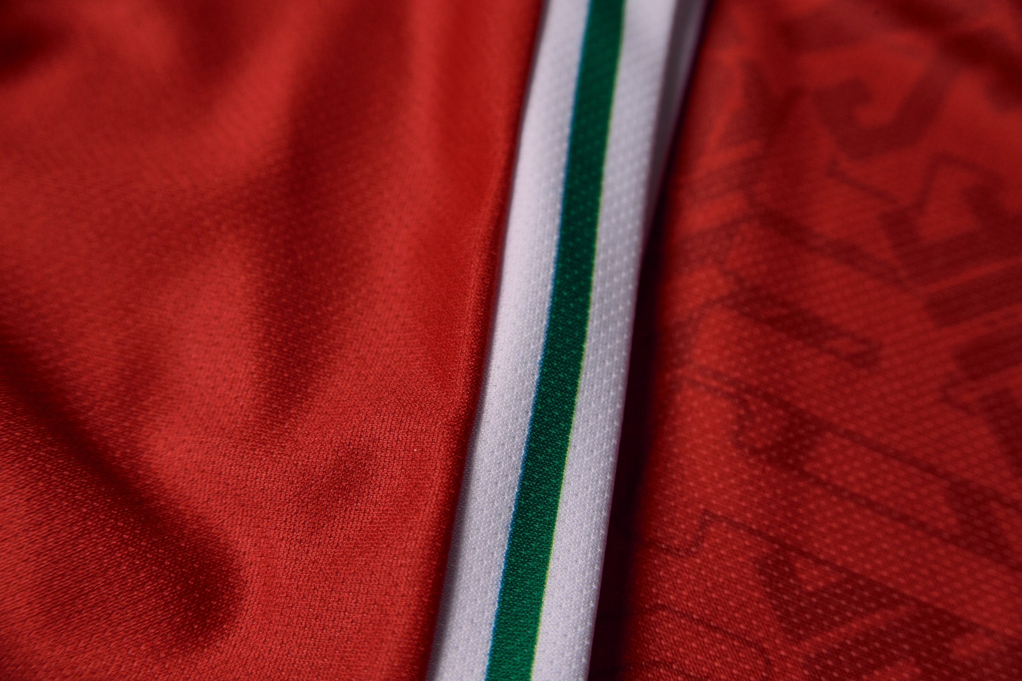 The home strip is red with red shorts and red socks and features a green trim on the collar and a green and white trim on the sleeve.