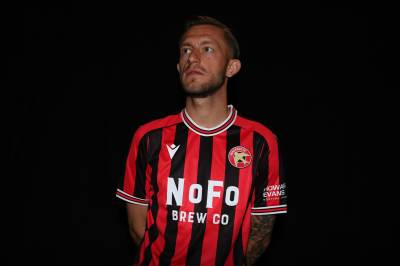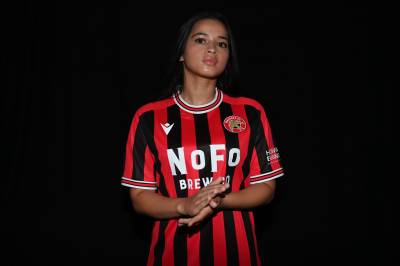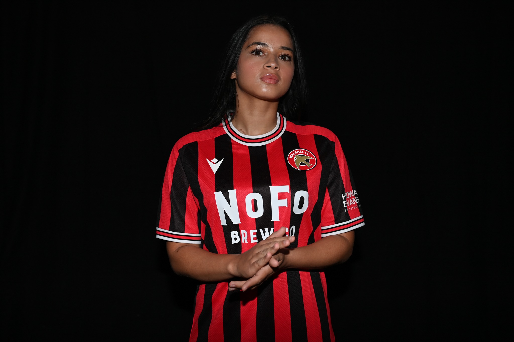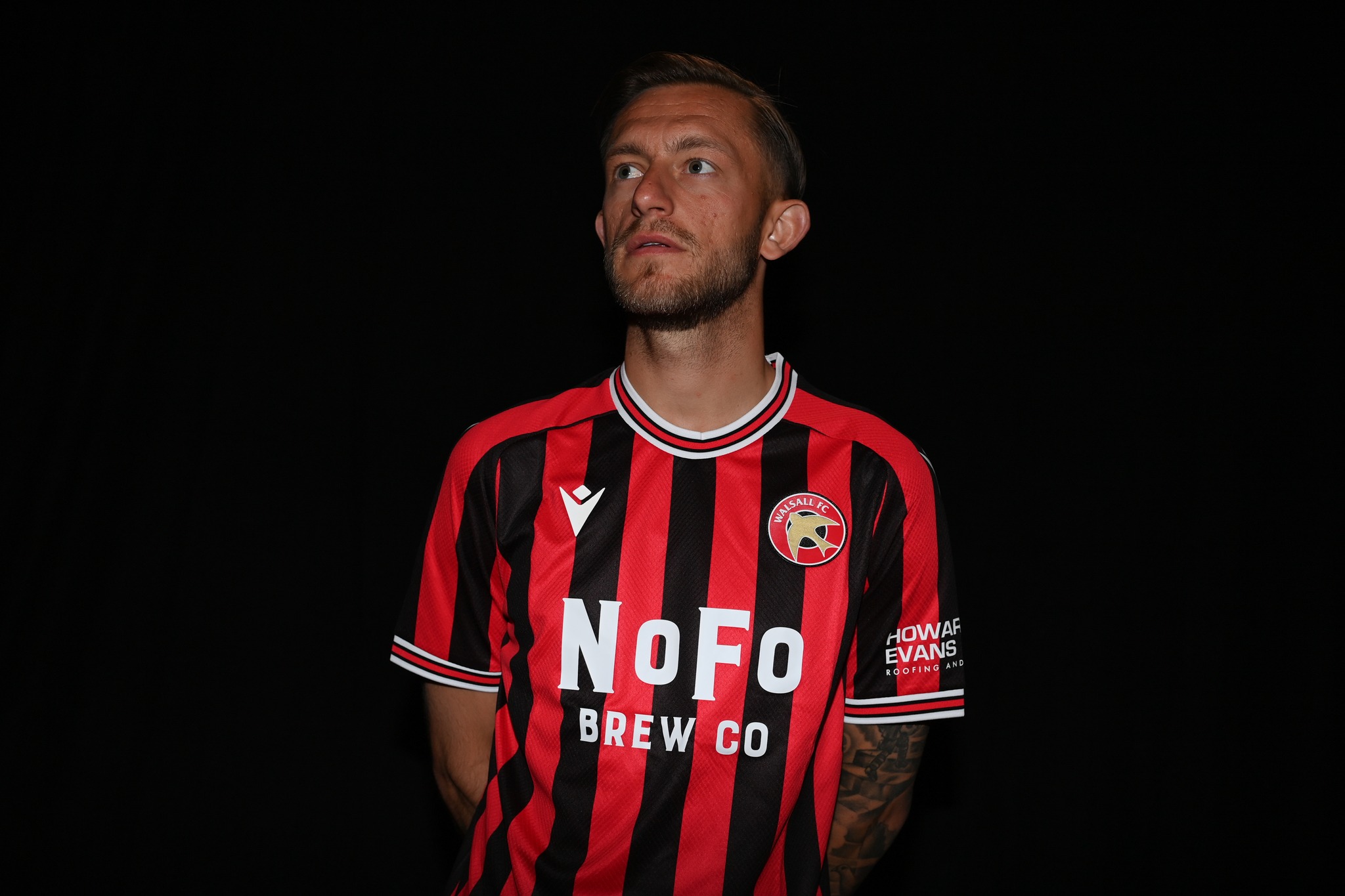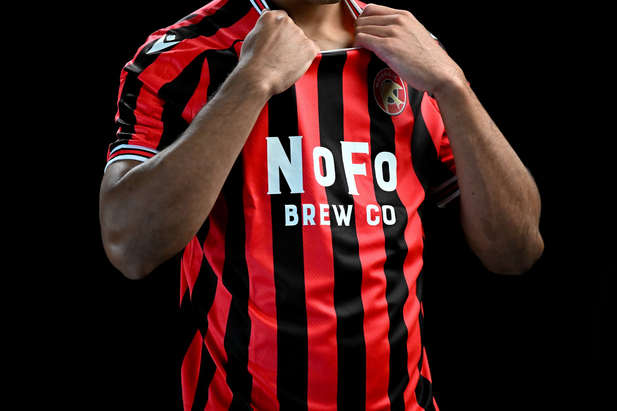 The club’s crest appears in full colour on the left chest, opposite the Macron logo, with new front-of-shirt sponsor NoFo Brew Co displayed prominently across the middle.