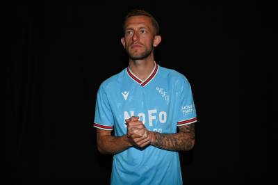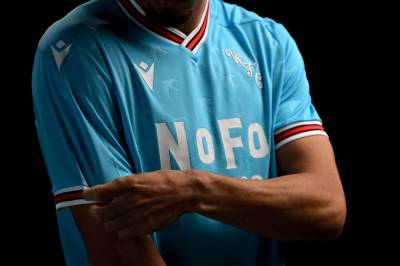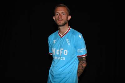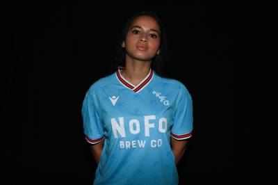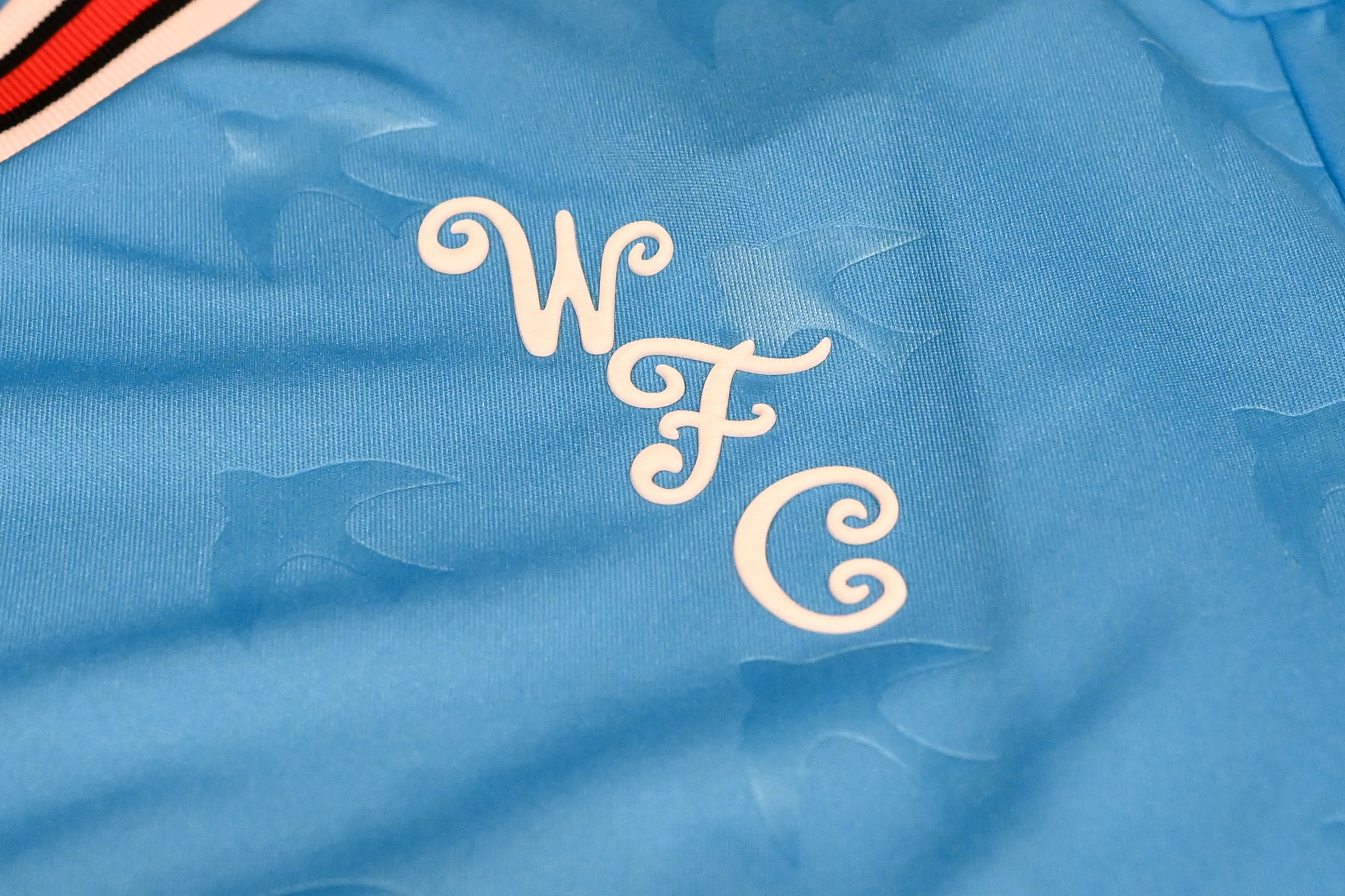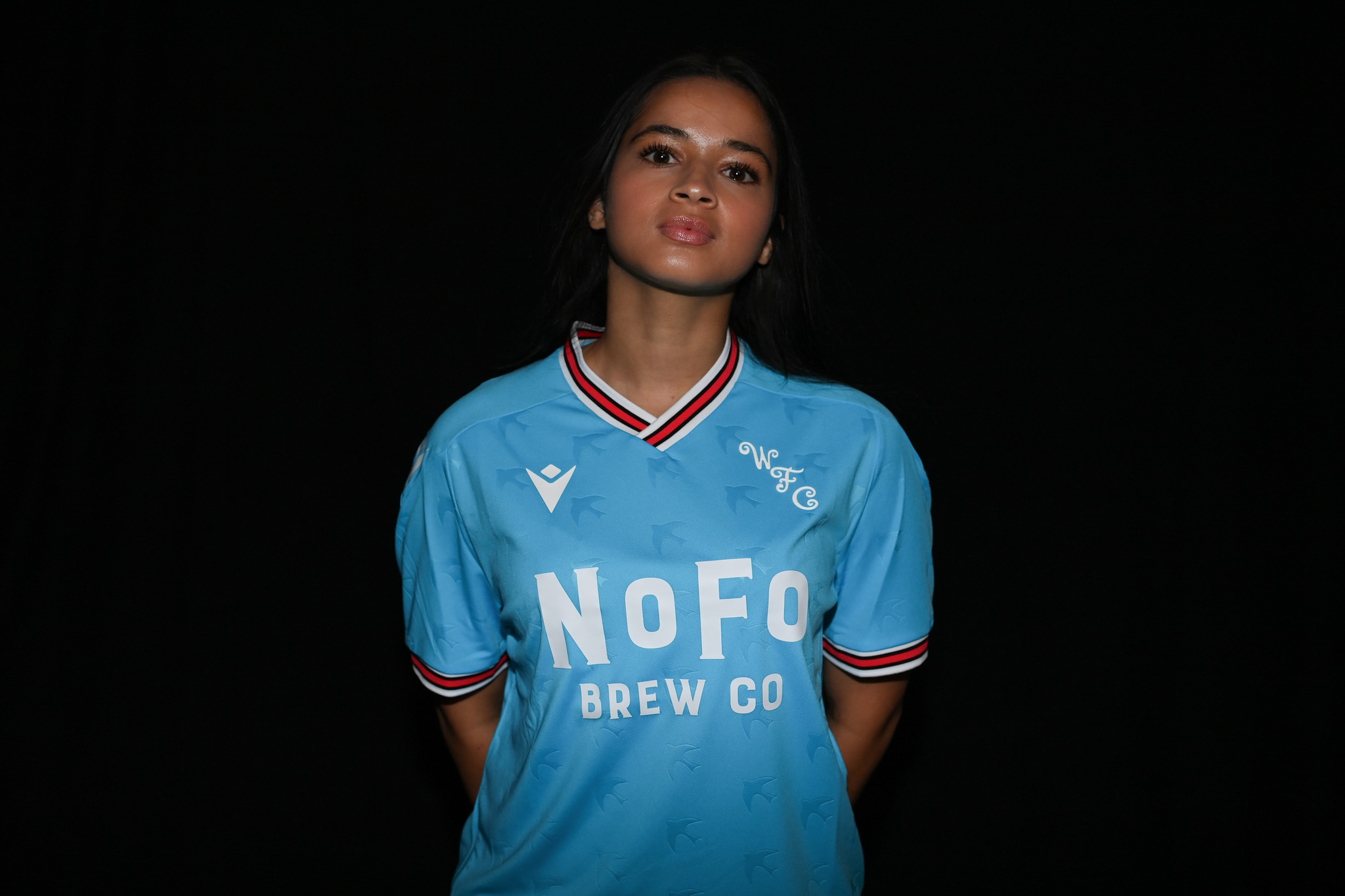 The shirt is Sky Blue with an overlapping v-neck collar featuring red black and white trim. White WFC lettering is placed on the chest in place of the club crest, and the front of the shirt carries the NoFo Brew Co sponsor. Swifts are embossed across the fabric, adding a bespoke detail to the design.