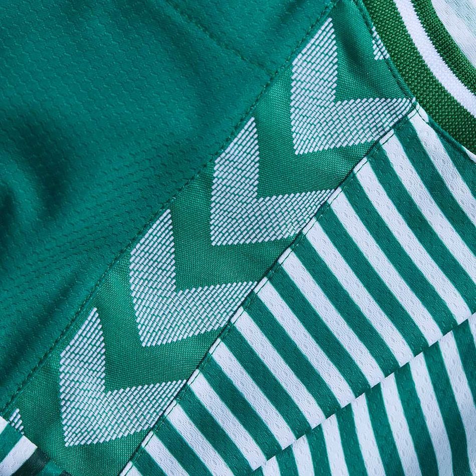 The new primary design sees supplier Hummel again deploying their “Mexico” template, which was most famously worn by the “Danish Dynamite” Denmark side at the Mexico ’86 World Cup, this time with one half of the trunk decorated with white and green stripes, the other with a mix of light and dark green.