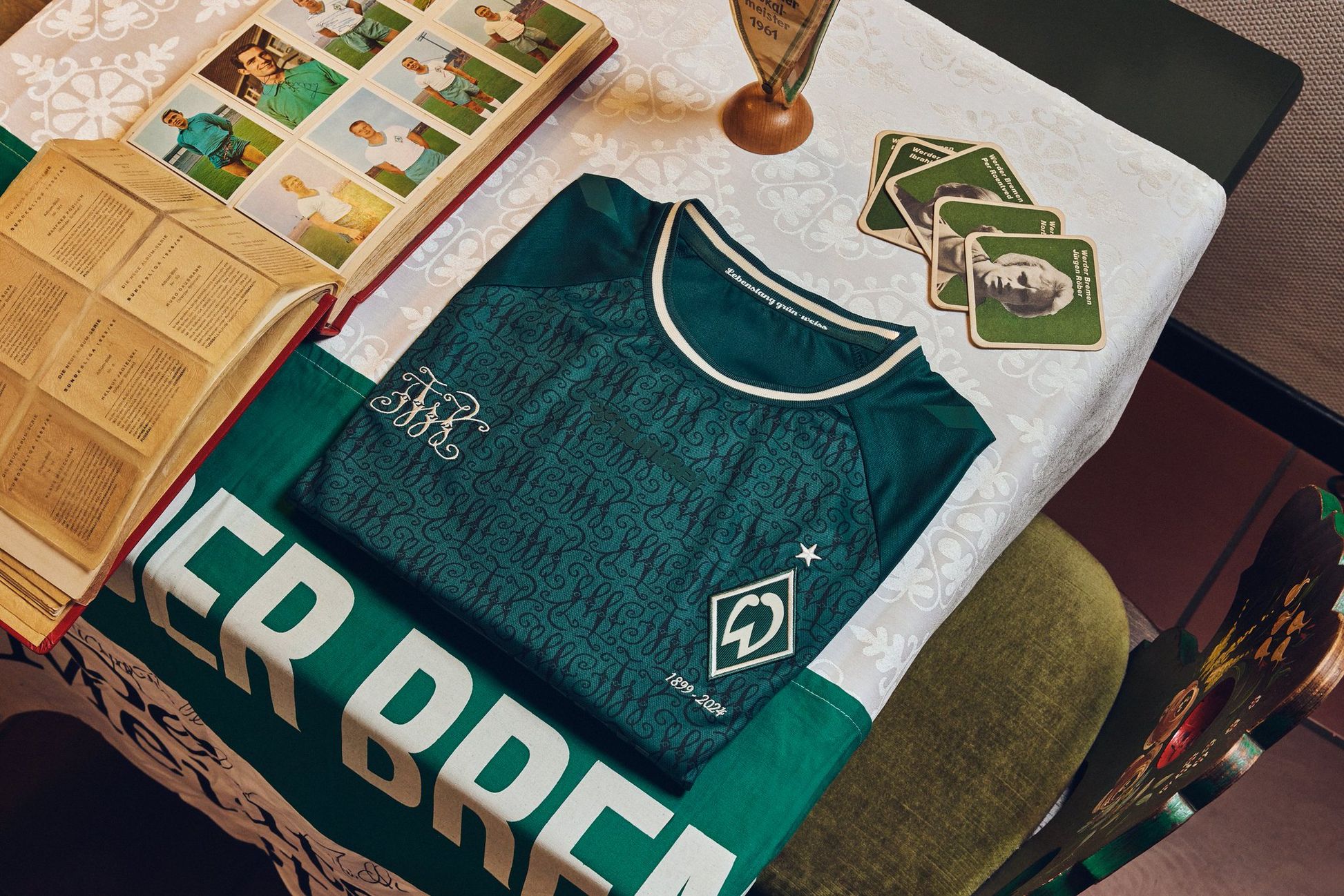 The design is a nod to the club's storied past, blending the contemporary Werder diamond with the vintage 1899 badge on a classic dark green backdrop.