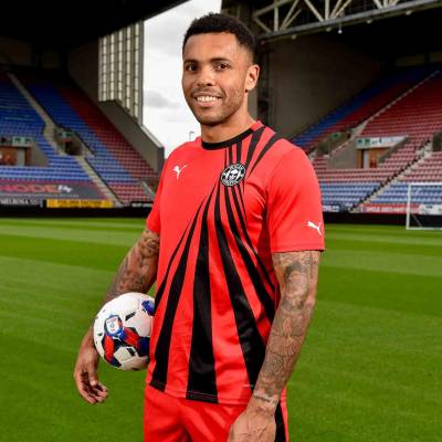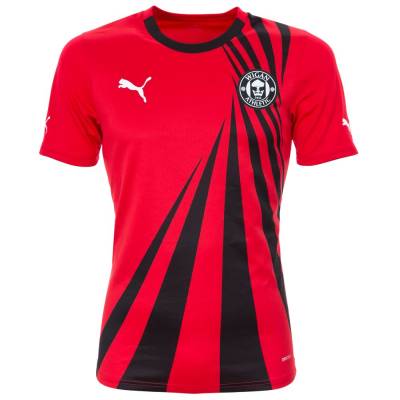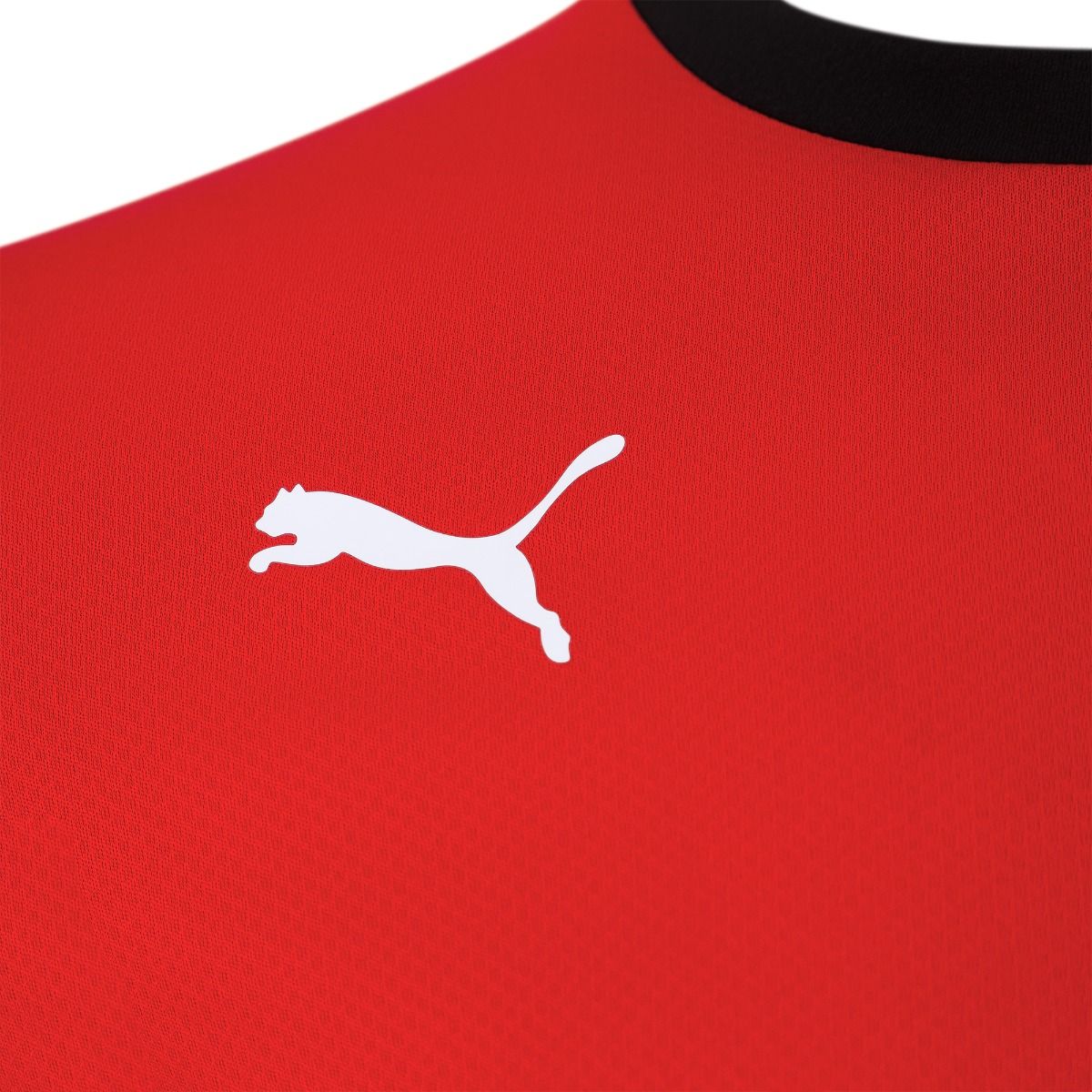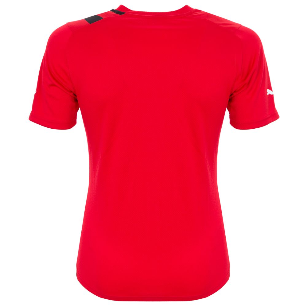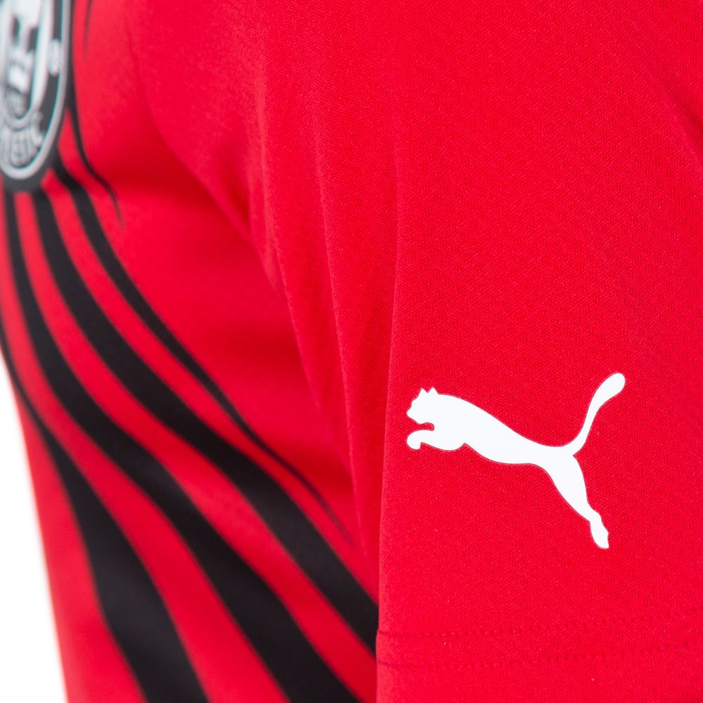In red with black, including a “sunbeam” effect that many will recognise from Puma designs that Austria wore at the 1990 “Italia ’90” World Cup, the new release as of the current season sees the crest converted to black and white and the German supplier’s logos appearing in white.