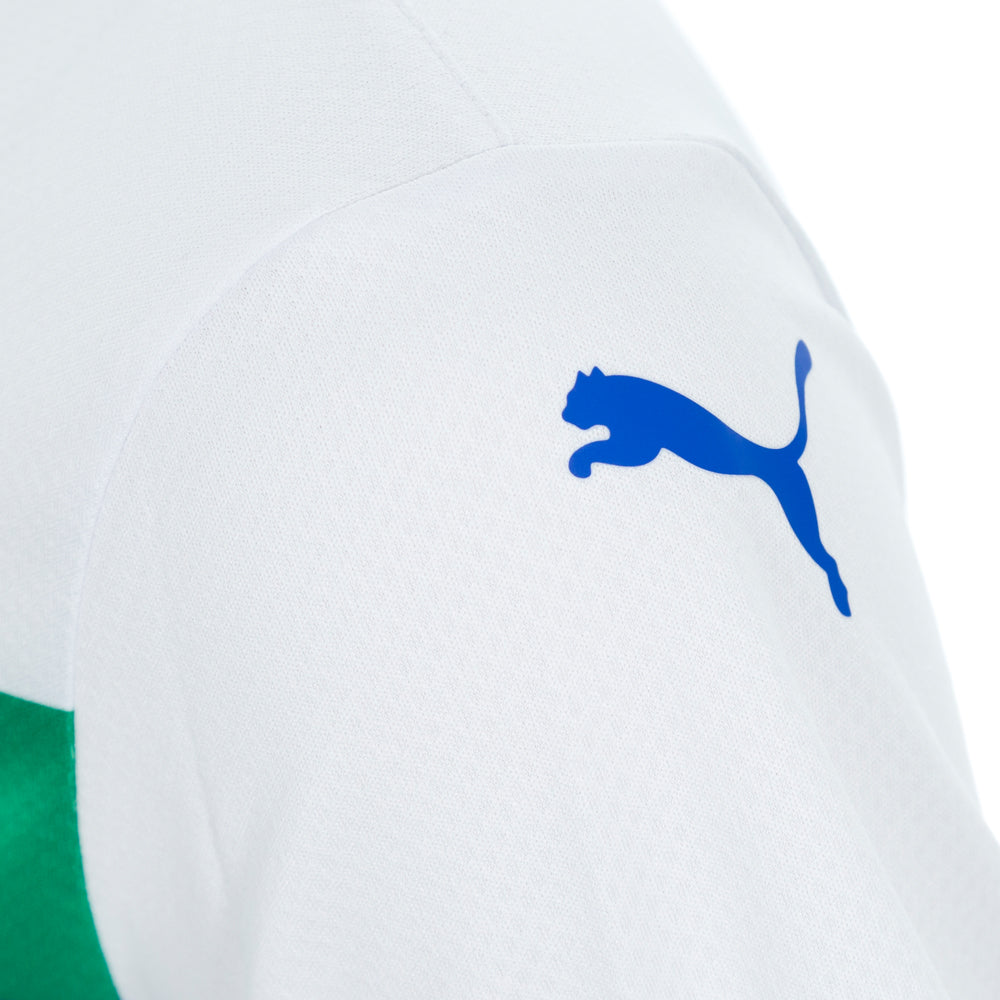 The crest is in full colour, the Puma logos contrast and the branding of the main sponsor appears in corporate livery, with the kit completed with white shorts and socks for a nominally all-white overall look.