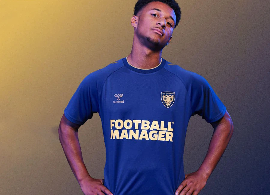 The use of said gold includes its place in the simplified crest palette, the Danish brand’s logos, the “FOOTBALL MANAGER” sponsor wordmark and the subtle trim, while the shirt’s construction includes raglan sleeve styling.