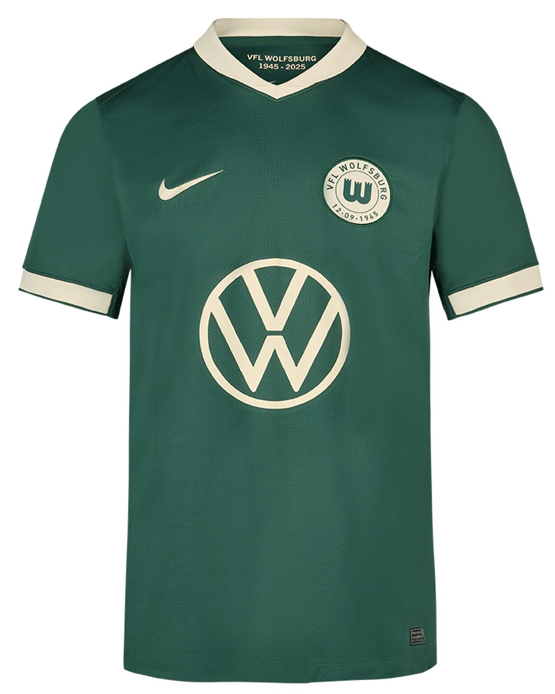 The Nike shirt is presented in dark green with an off-white collar and cuffs featuring a green trim, while a modern V-neck collar carries the inner detail “VfL Wolfsburg 1945–2025”.
