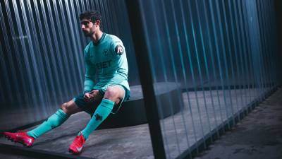 The full kit is completed with Dark Sea shorts and bright turquoise socks, which feature a black geometric wolf graphic on the shin and black detailing around the top.